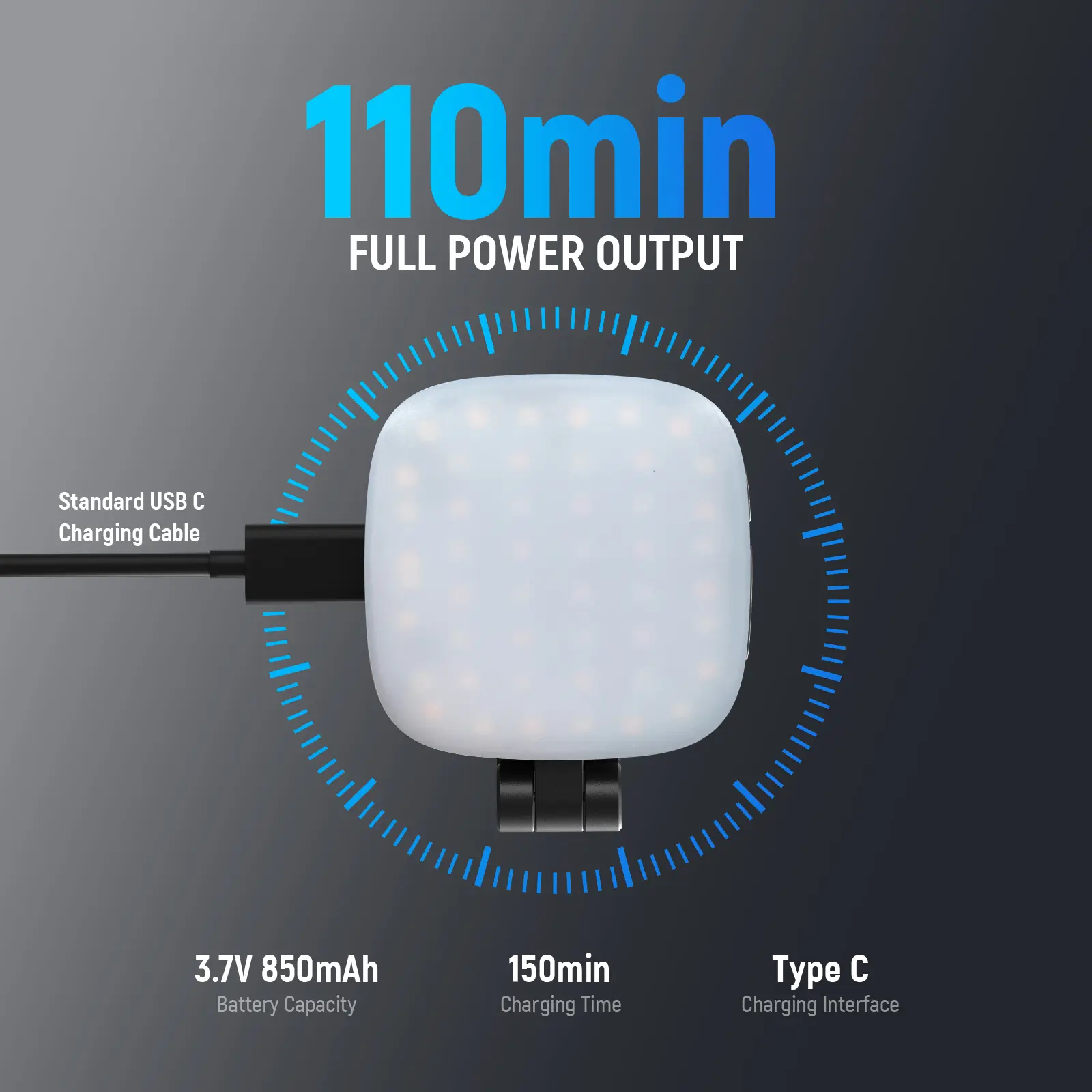 Built-in 850mAh battery runs up to 110 minutes at full brightness and recharges in 150 minutes via USB-C for portable, on-the-go lighting.