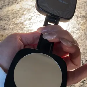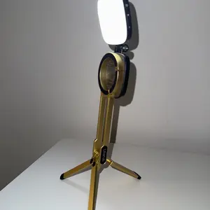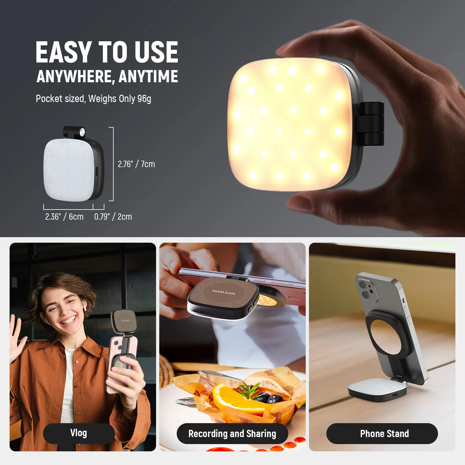 Pocket-size (6×7×2cm, 96g) design functions as a ring light, desk phone stand, and makeup mirror — perfect everyday accessory for creators and travelers.