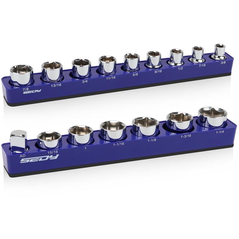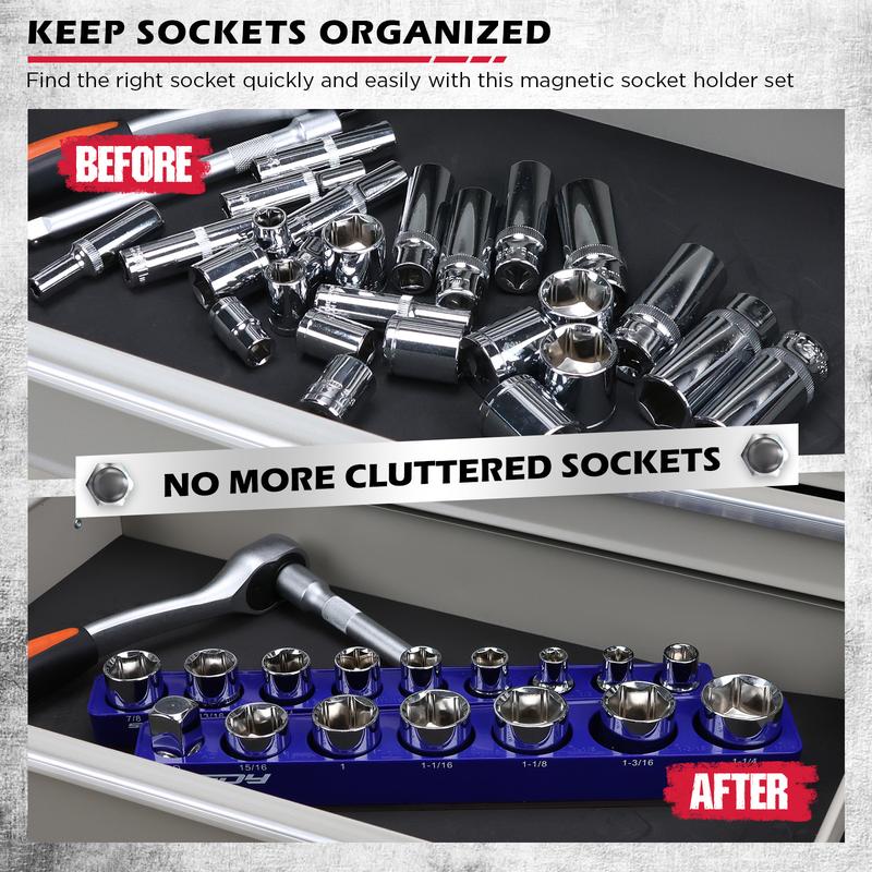·MODULAR DESIGN - Customizable and detachable, the 2-Piece 1/2"-Drive SAE Magnetic Socket Organizer set adapts perfectly to any toolbox, cart, or wall mount, offering ultimate storage flexibility for your garage or workshop