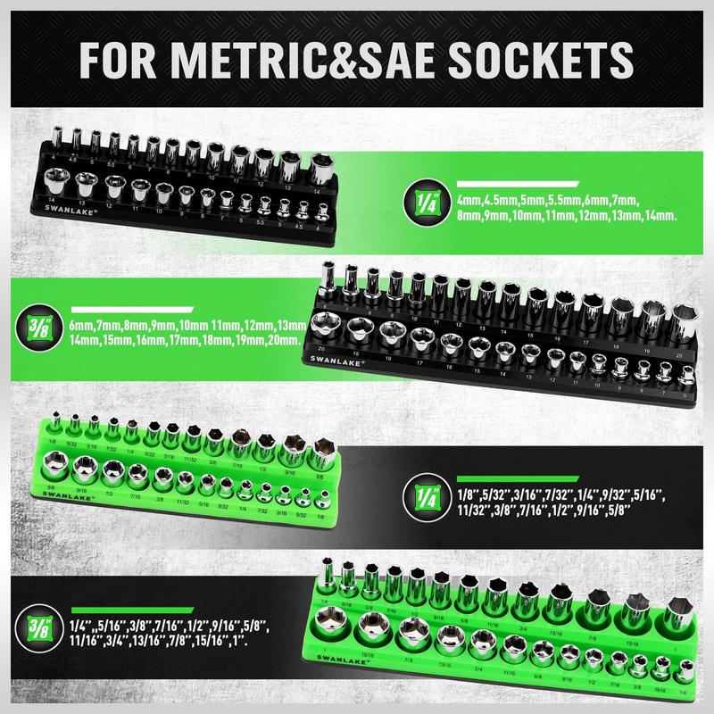 Keep your tools neatly organized with the SWANLAKE Magnetic Socket Organizer Set. Made from durable ABS plastic, this 4-piece set is designed to hold a total of 108 metric and SAE sockets, including both shallow and deep sizes. The set includes two black metric socket trays and two green SAE trays for 1/4" and 3/8" drives, ensuring easy organization and quick access.