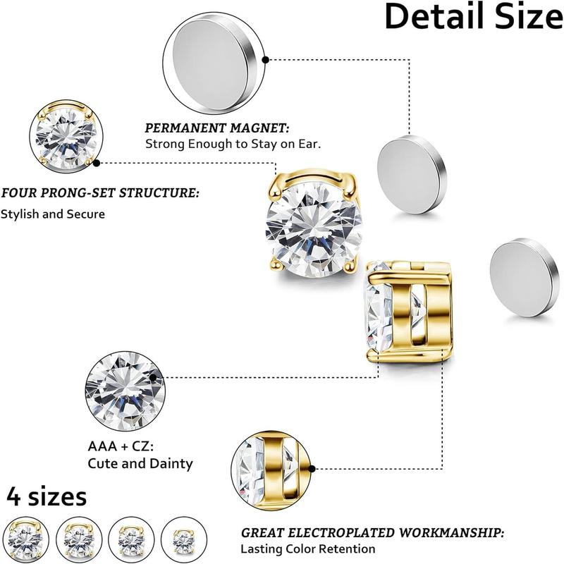 4 Pairs Stainless Steel Mens Womens Magnetic Stud Earrings Non-piercing CZ 4-7mm