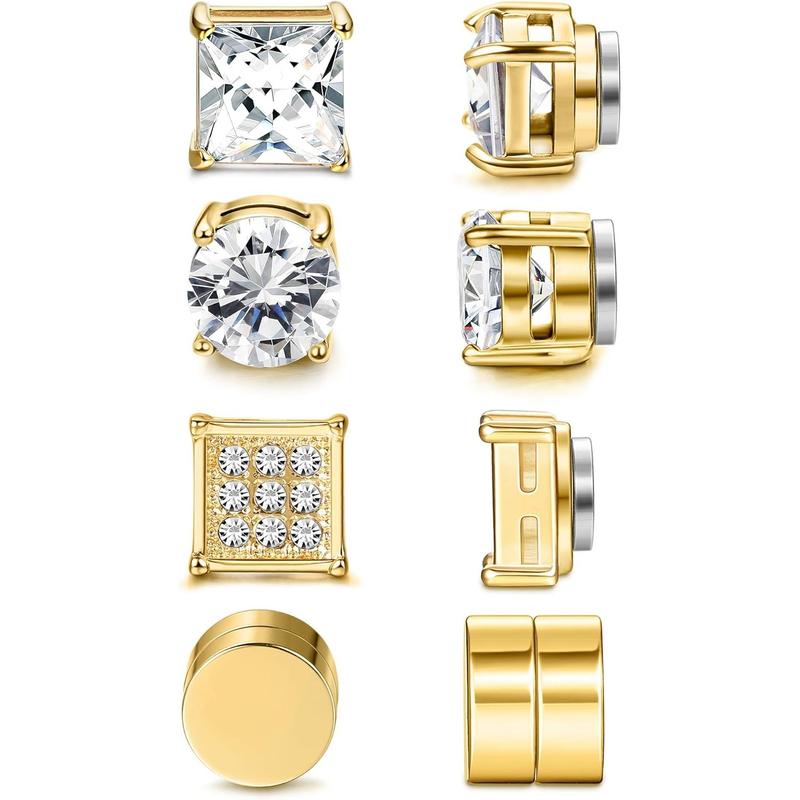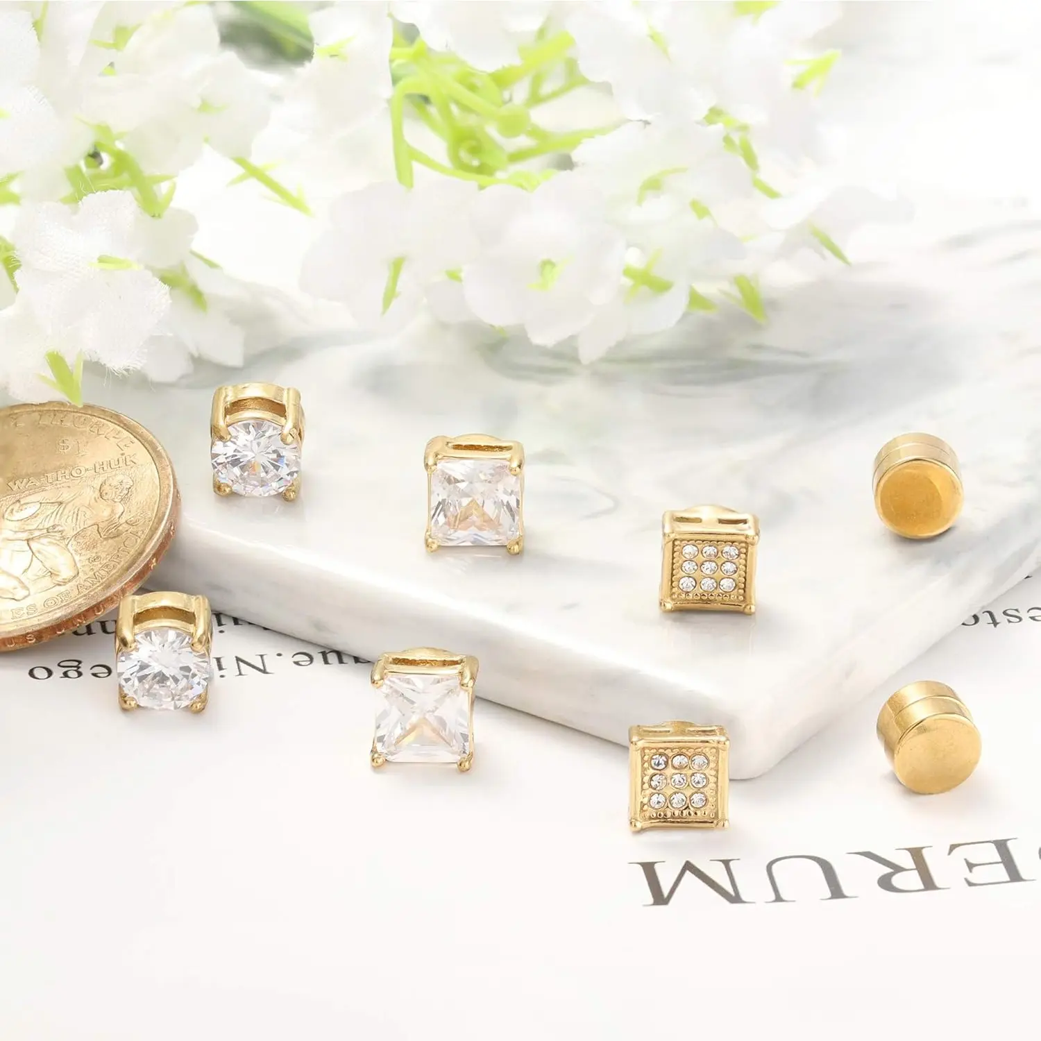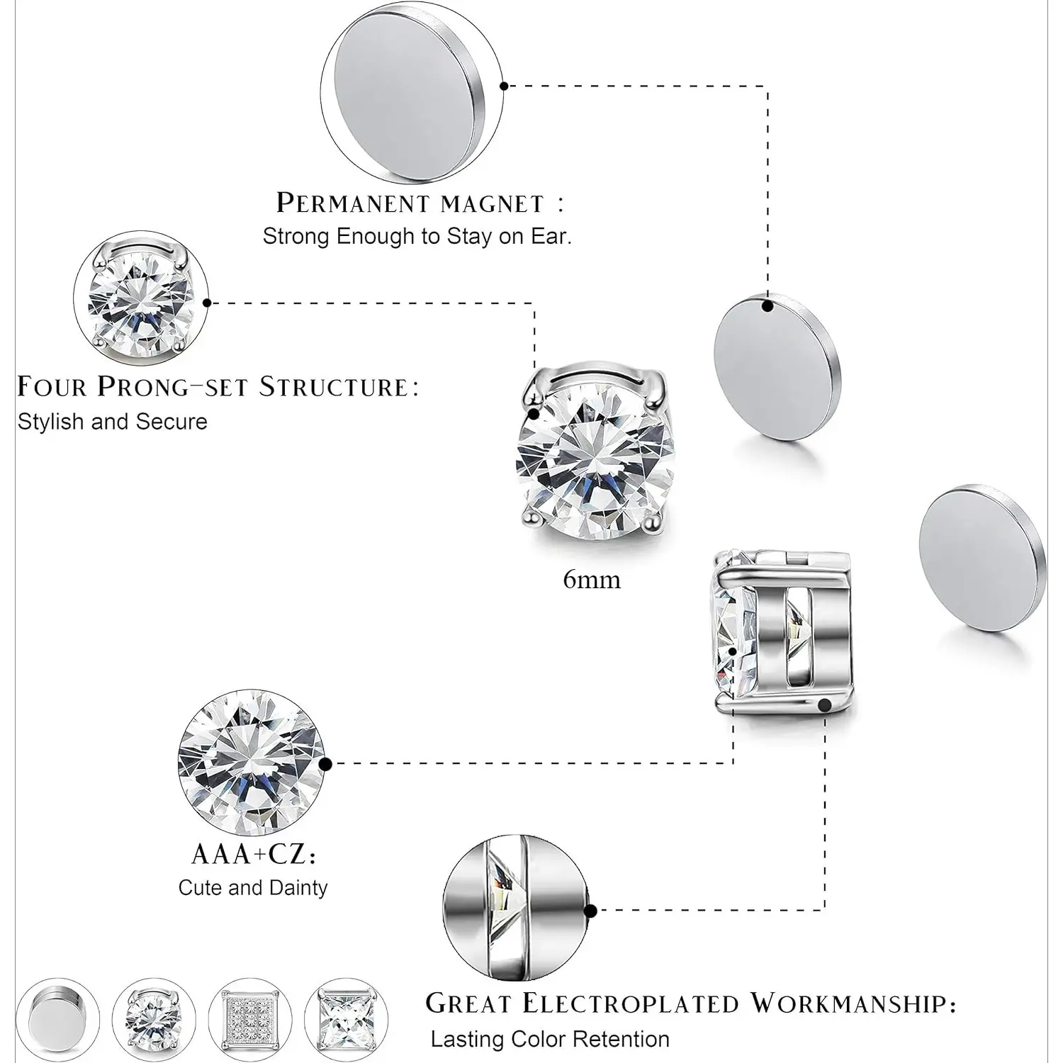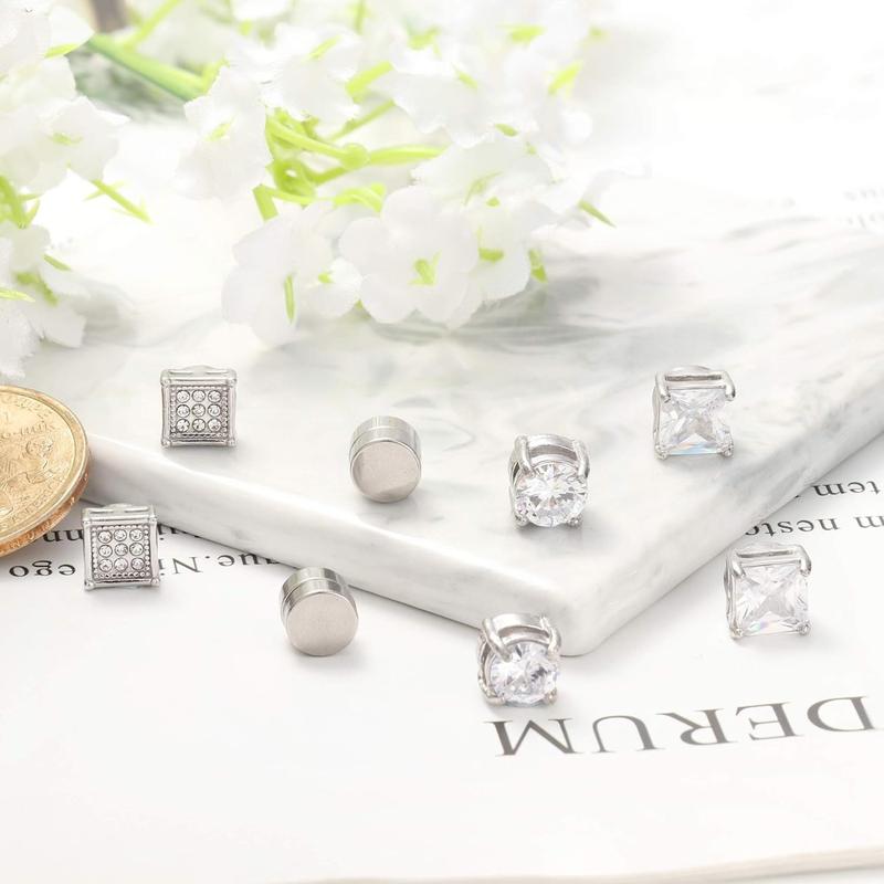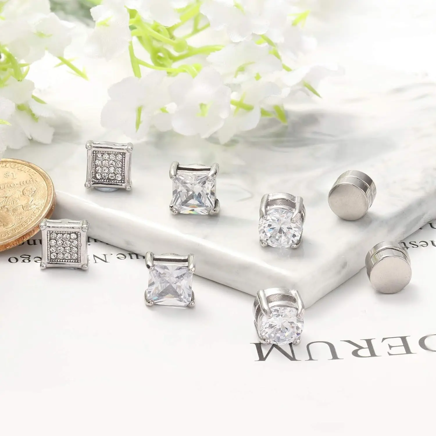 4 Pairs Stainless Steel Silver Magnetic Stud Earrings CZ Non-Piercing Clip On Stud Earrings Set