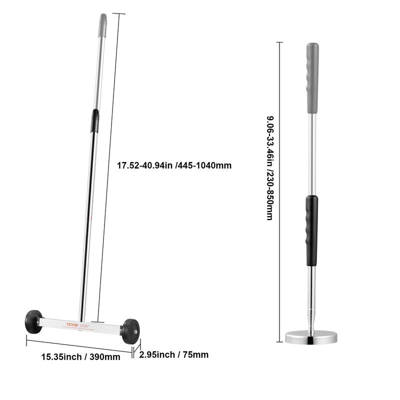 • Adjustable Heights: The telescoping handle allows for adjustable heights. The 15'' rolling magnetic sweeper adjusts from 17.52 to 40.94 inches (445-1040 mm), while the 3.2'' telescoping magnetic pickup tool adjusts from 9.06 to 33.46 inches (230-850 mm). Say goodbye to bending fatigue with convenient storage and easy portability.