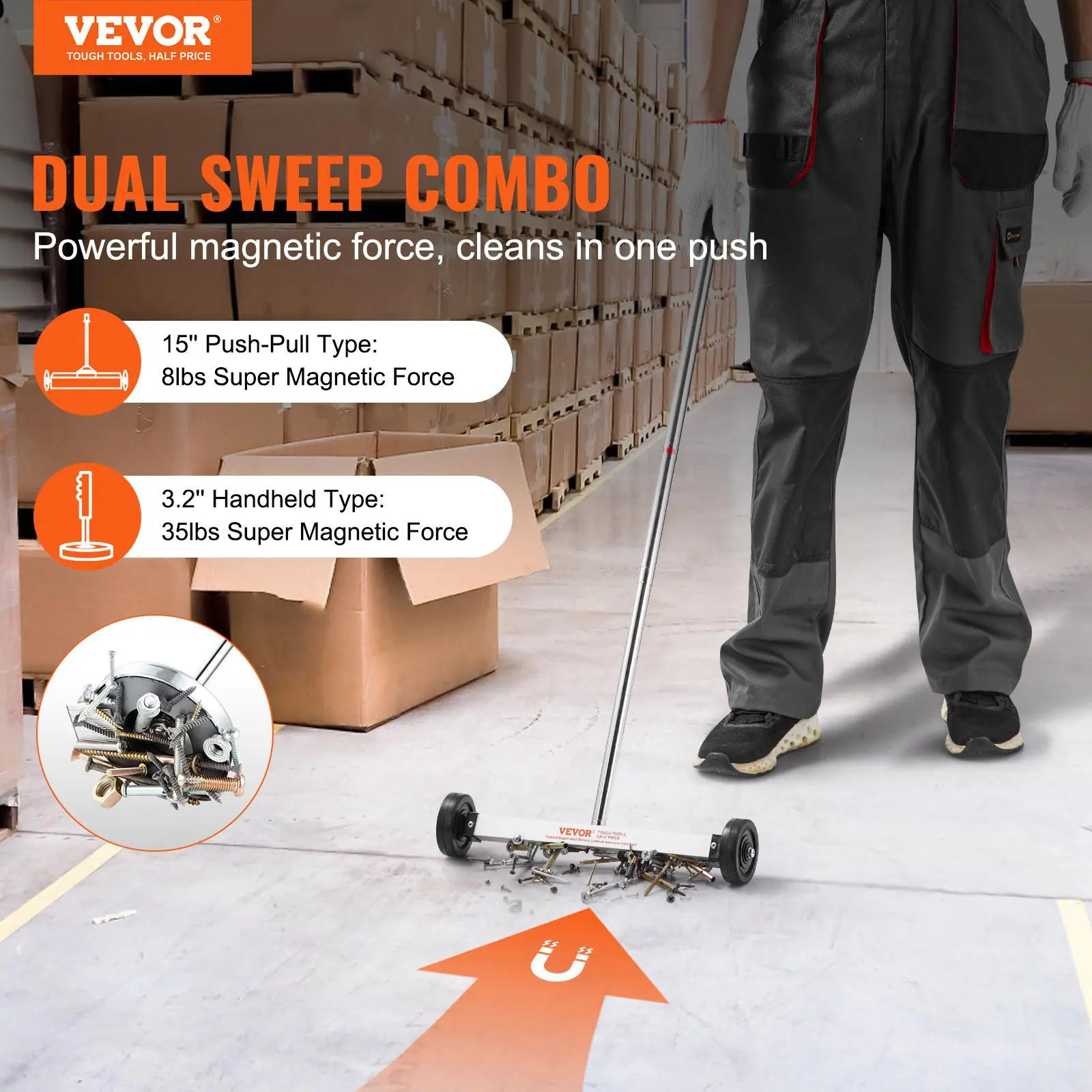 • Superior Magnetic Power: The VEVOR magnetic sweeper with wheels includes a 15'' magnetic sweeper with wheels and a 3.2'' telescoping magnetic pickup tool, capable of holding up to 8 lbs (15'') and 35 lbs (3.2'') respectively. It effortlessly collects nails, screws, and black metal debris, protecting you from shards and sharp metals.