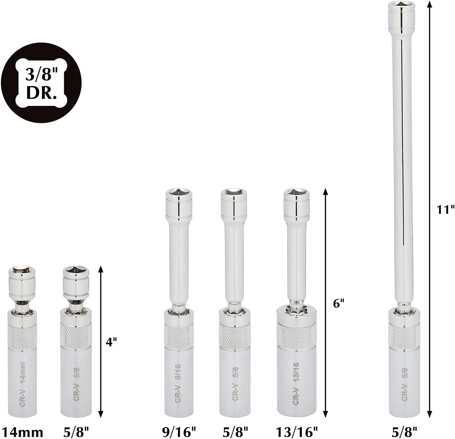 ·3/8-Inch Drive Magnetic Spark Plug Socket Set Include: 9/16-Inch, 5/8-Inch, 13/16-Inch, 14mm Socket, Total Length: 4 inch, 6 inch, and 11inch