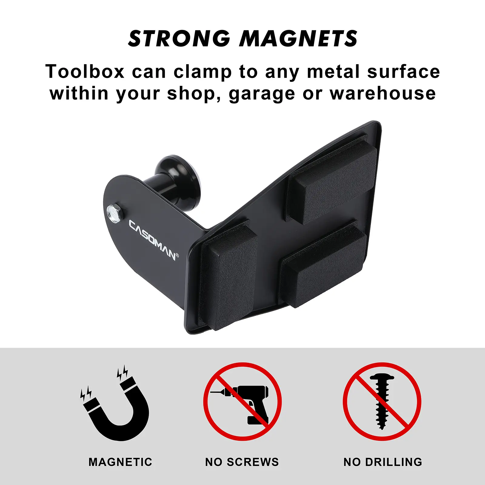 The rubber-coated bottom with strong magnets that easily attach to any metal surface in your shop, garage, or warehouse without leaving behind scratches or damage.