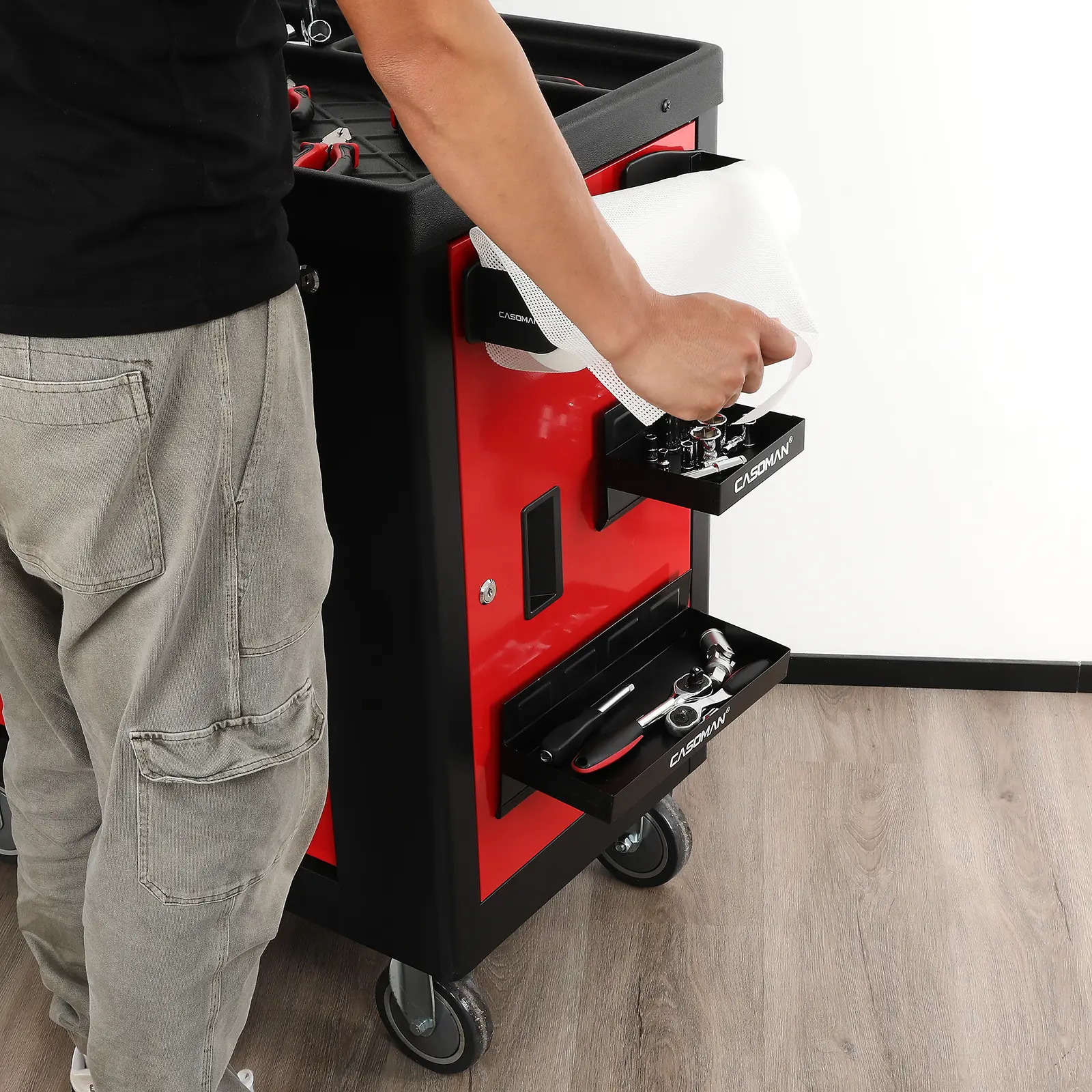 The magnetic paper towel holder provides easy access to shop paper towels as you work, helping to keep your workspace cleanly.
