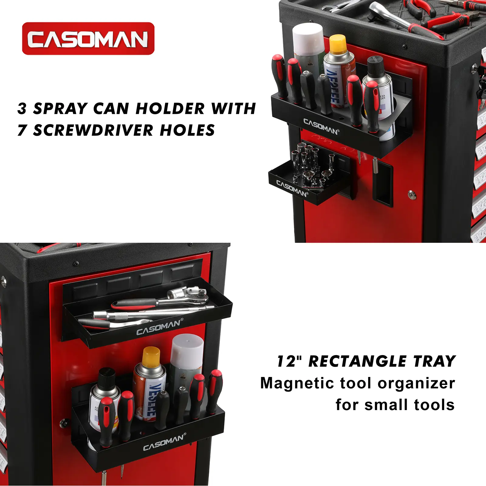 The Magnetic Toolbox Shelf, Tray, Paper Towel Holder, 4-Piece Set, Black, Variety of Use, Durable, Magnets any metal surface, which is Made of stainless steel with magnets, strong and durable. Tool tray organizer set comes with a 6" rectangle tray, 12" rectangle tray, 2-piece paper towel holder, 3 spray can holder with 7 screwdriver holes. The rubber-coated bottom.