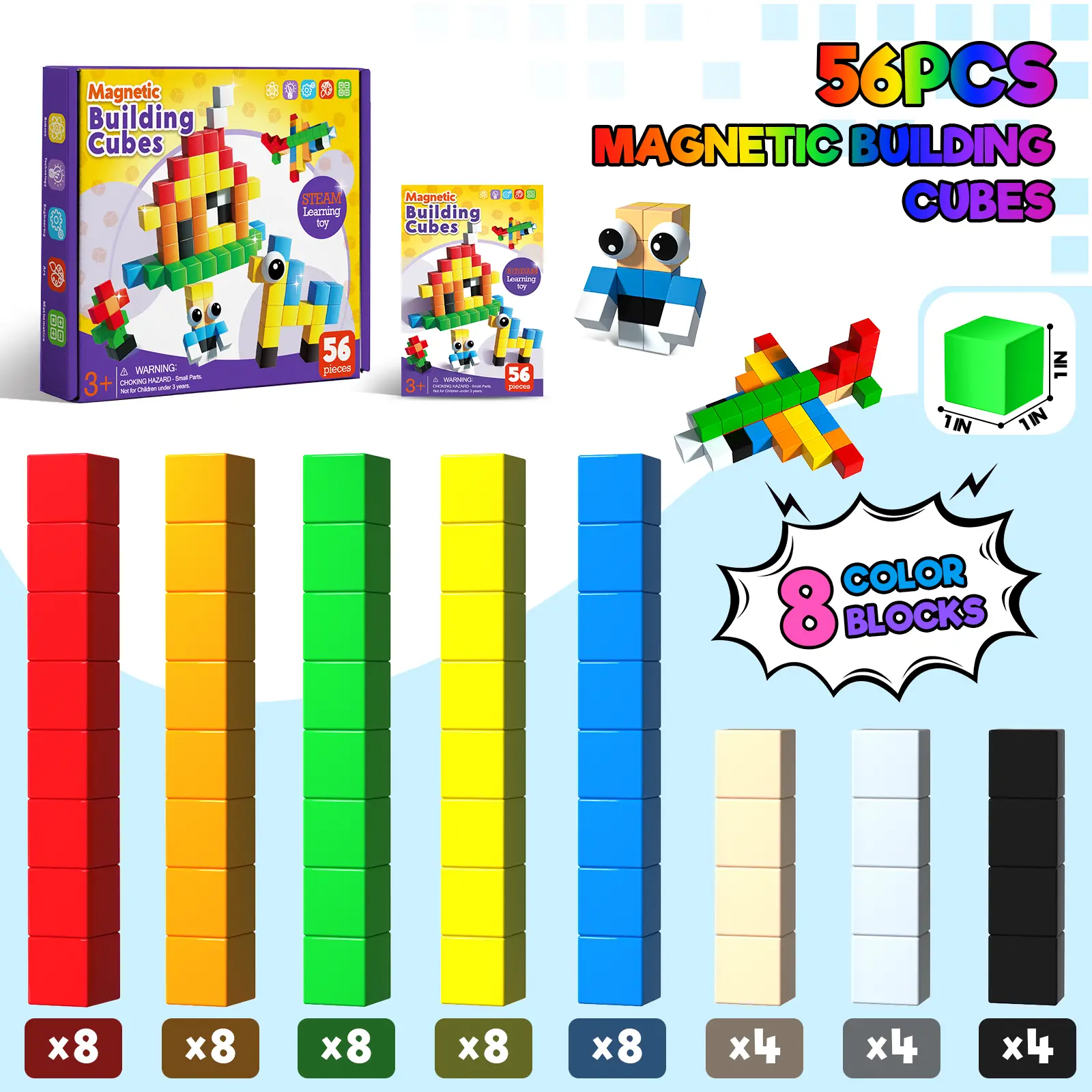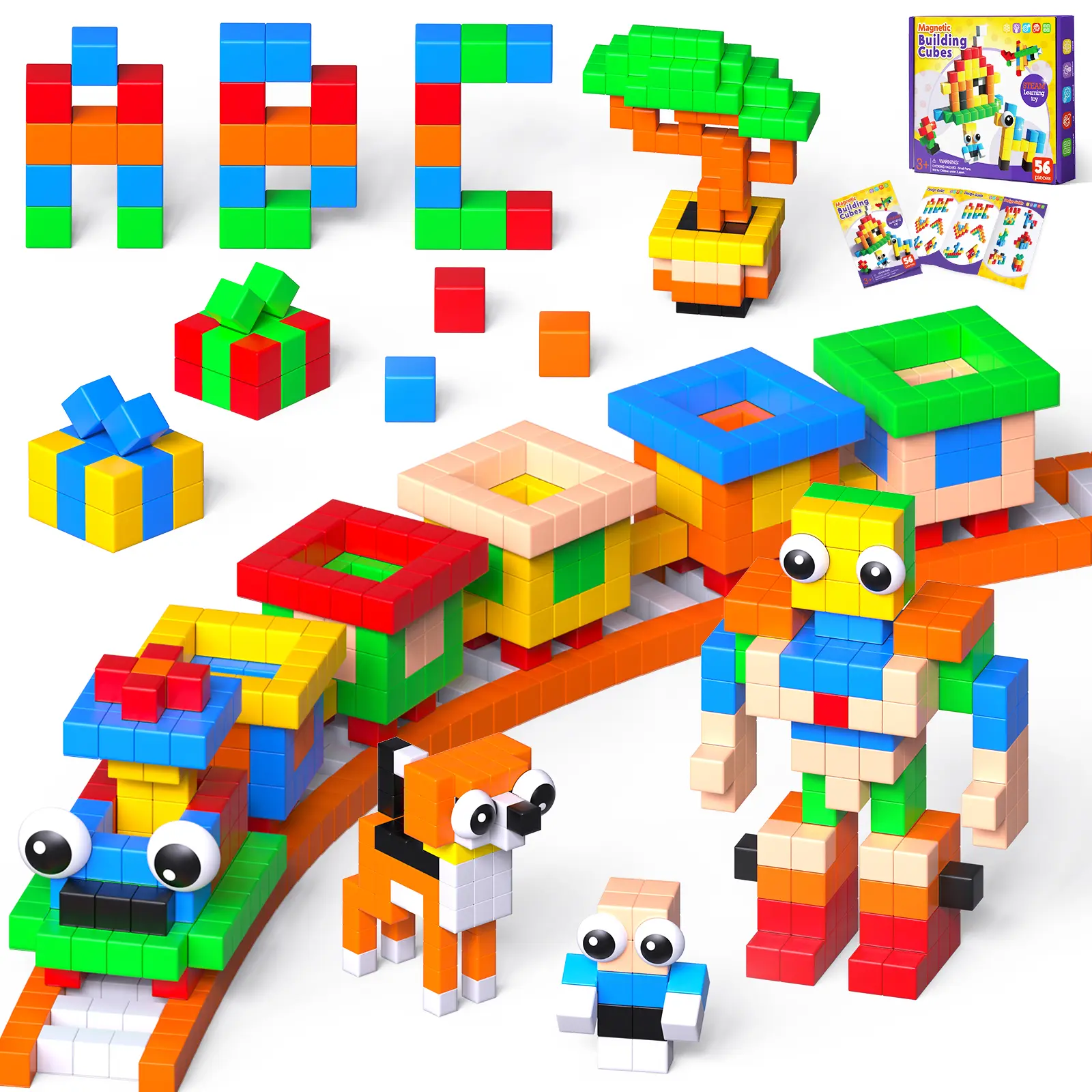 This set includes 56 large magnetic cubes (3D magnetic blocks) and a step-by-step idea booklet.
