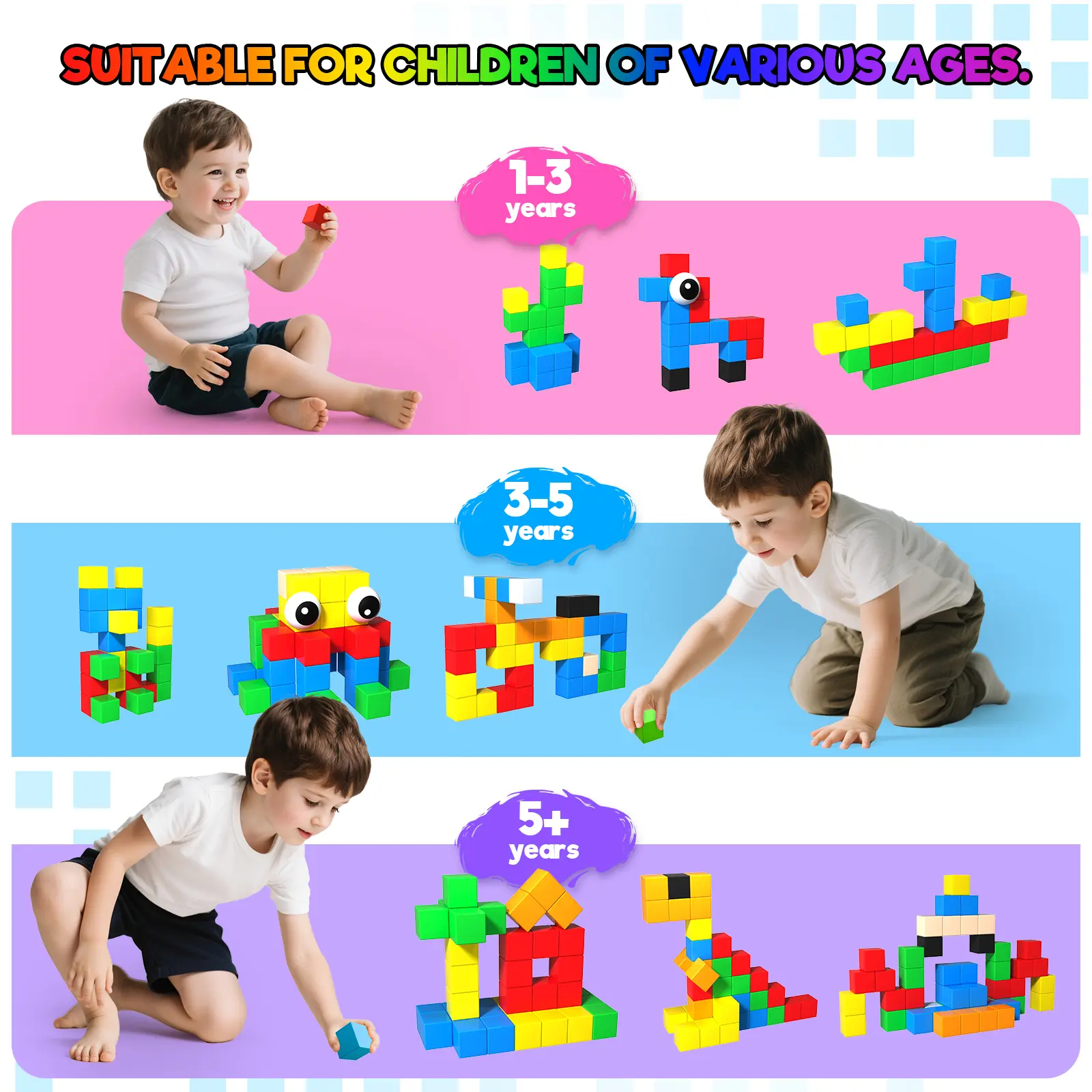 The larger cube size helps prevent swallowing risks and makes gripping easier for younger kids.