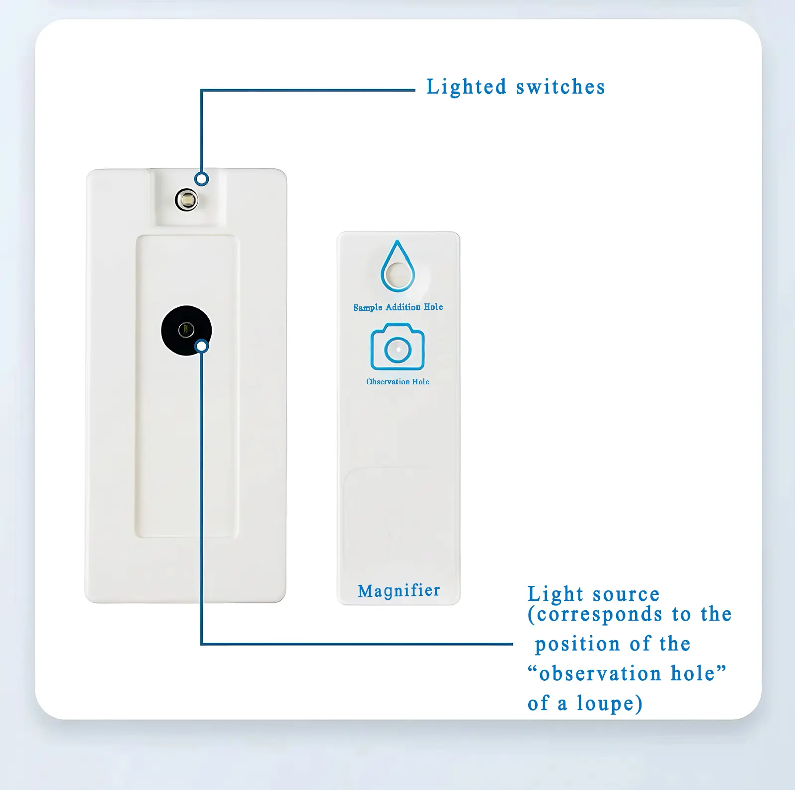 Disposable Magnifier:The magnifier is a single-use product made from medical-grade sterile materials to prevent bacterial contamination and ensure hygiene and safety with each use. The disposable design eliminates the need for repeated cleaning, making it convenient for users to conduct quick tests while avoiding cross-contamination. After use, users can simply dispose of the magnifier, maintaining high cleanliness standards.