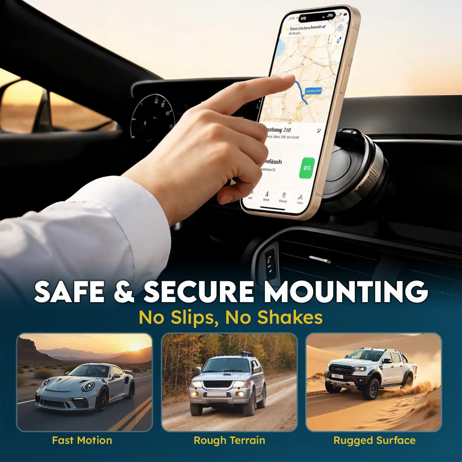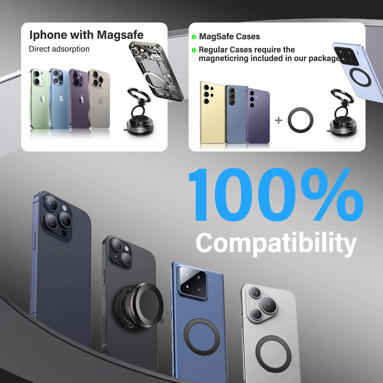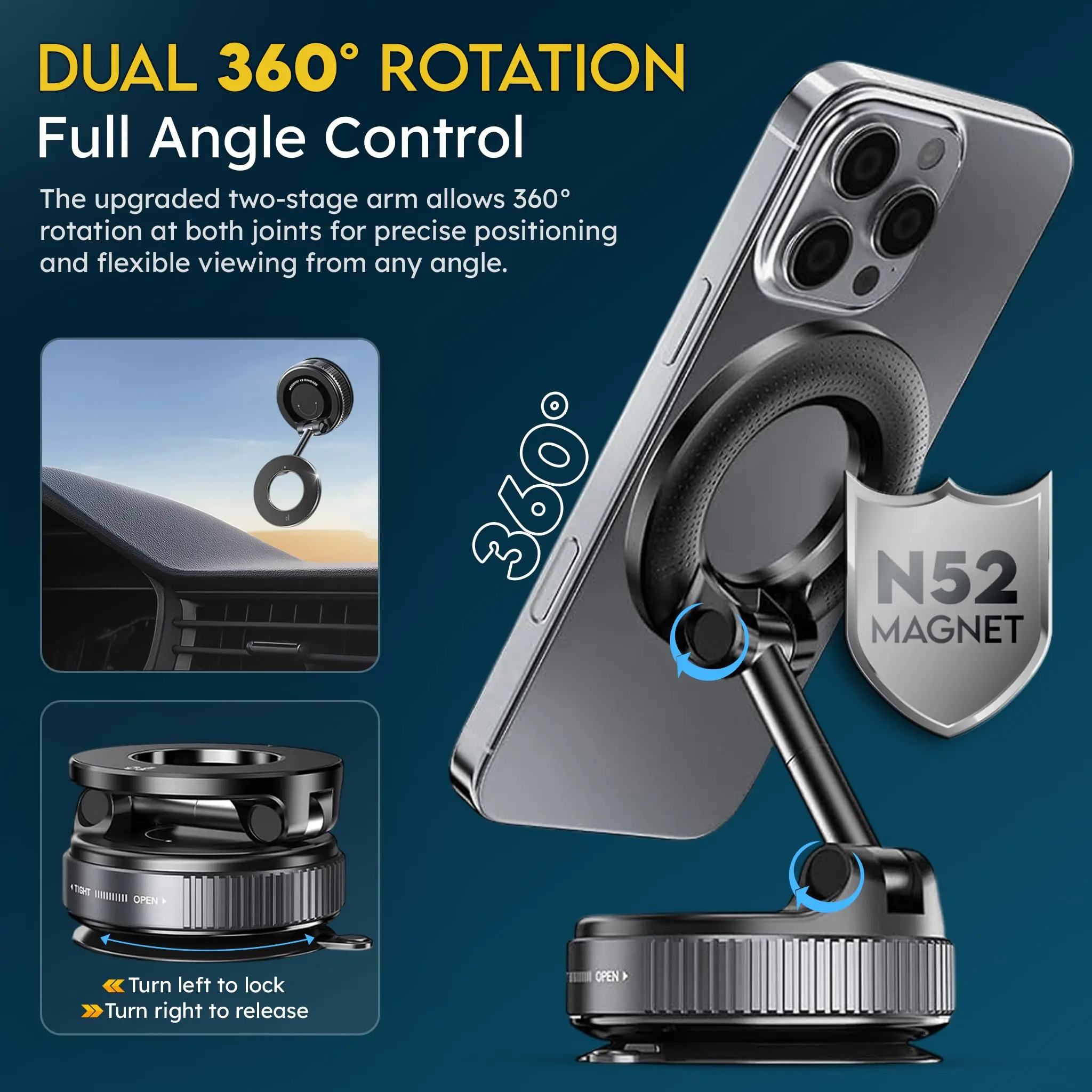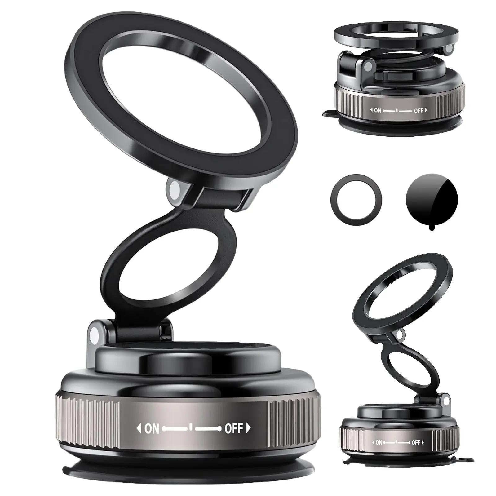 Ever struggled with a phone holder that just won't stay put during your drive? Meet your new best road buddy: the MagSafe Vacuum Magnetic Super Suction Cup Car Phone Holder. This clever mount combines ultra-strong 4200 Gauss magnets with military-grade vacuum suction that outperforms traditional holders by 80%, keeping your phone rock-solid even on bumpy roads or sudden stops. Whether you're cruising or parked, the 360° rotating base and 210° dual-axis folding arm let you find the perfect angle—portrait or landscape—for navigation, calls, or music control. Plus, its removable base and foldable design shrink the holder by half, making it super easy to switch from car dashboard to desk or hotel nightstand without leaving sticky residue. Compatible with iPhone 12 through 16 series MagSafe and most cases under 3mm thick, it even comes with a magnetic ring for other phones, so everyone’s covered. Inside the box, you get the mount, 3M adhesive pads, anti-slip mats, and a metal magnetic ring for non-MagSafe phones. Ready to upgrade your hands-free experience? Grab this versatile, sturdy phone holder and enjoy safer, smarter drives with your smartphone always in sight and secure.
