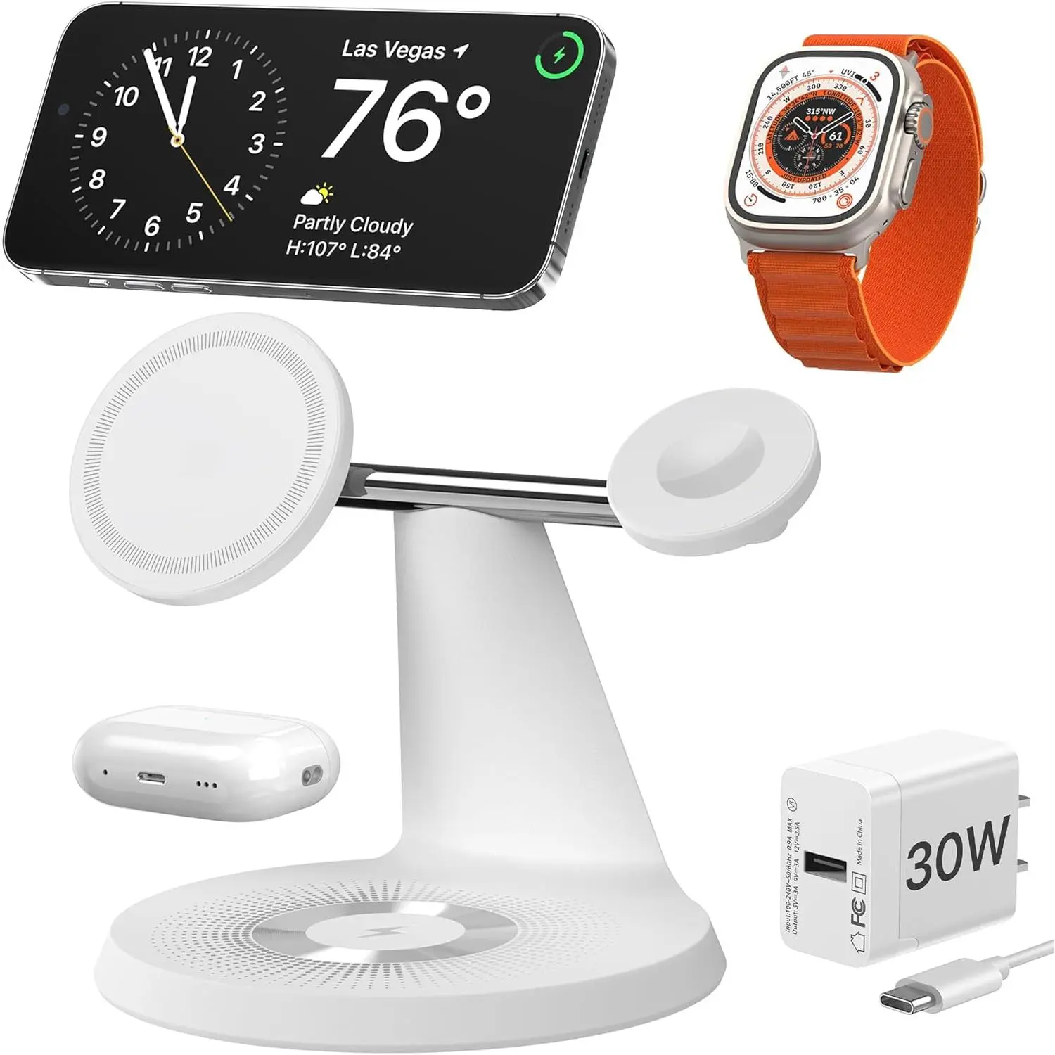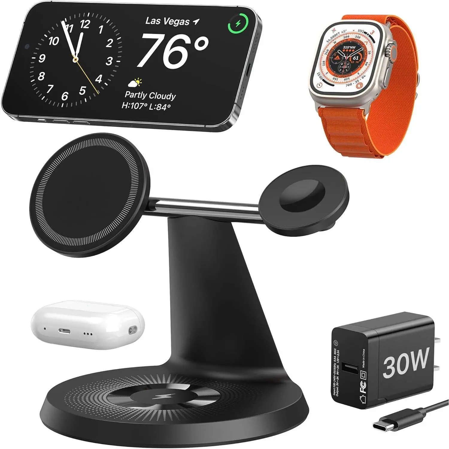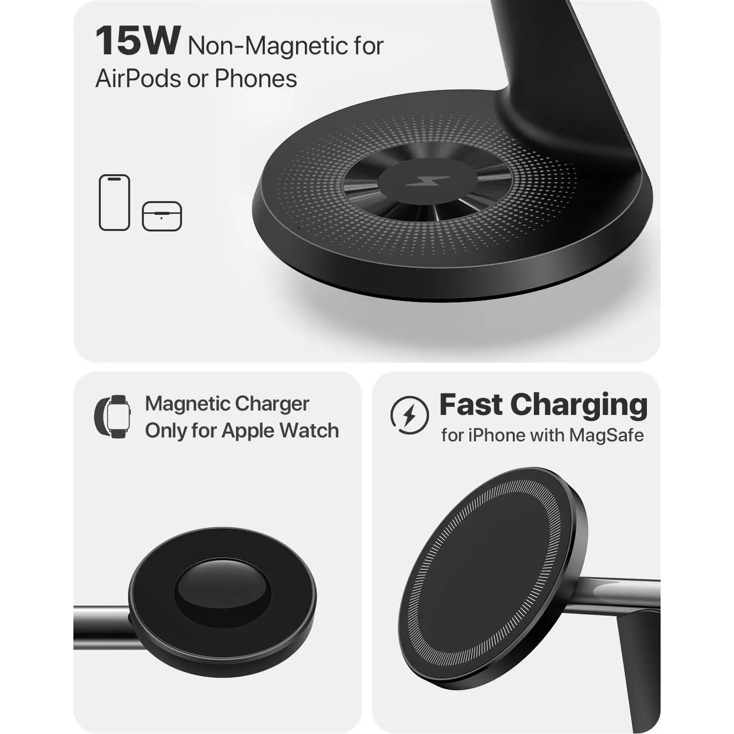 The phone charger of this charging station is designed for MagSafe-compatible phones (iPhone 14 /13 /12 series), and can be used with MagSafe-approved cases. It is highly recommended to charge without a case or use a case with Mag-Safe.