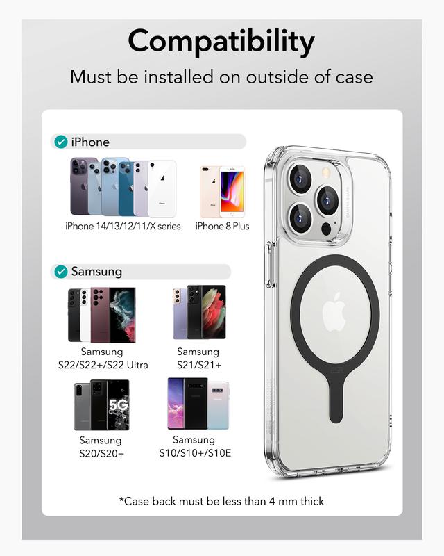 Ever wish your favorite phone case could do more? With the ESR MagSafe Sticker 360, you can upgrade your existing PC or TPU case to enjoy the magic of MagSafe wireless charging—no need to buy a new case! This magnetic ring magnet triples the magnetic strength, locking your phone securely to all MagSafe accessories. Plus, it ensures perfect alignment between your phone and charger for faster, hassle-free tap-and-go charging. Installation is a breeze with the easy alignment guide, taking all the guesswork out of setup. Just stick it on the outside of your case (under 4mm thick) and you’re ready to go. Compatible with iPhone 11 through 17, Samsung Galaxy S21 to S23, and Google Pixel 10, this kit keeps your wireless charging options open—use MagSafe or any standard charger with proper alignment. Please note it doesn’t support silicone, leather, or glass cases. Included in the box are two magnetic rings and helpful setup resources. Plus, ESR backs you with a 12-month warranty and lifetime support for any questions. Ready to unlock your case’s full wireless charging potential? Snap on the ESR MagSafe Sticker 360 and power up with ease!