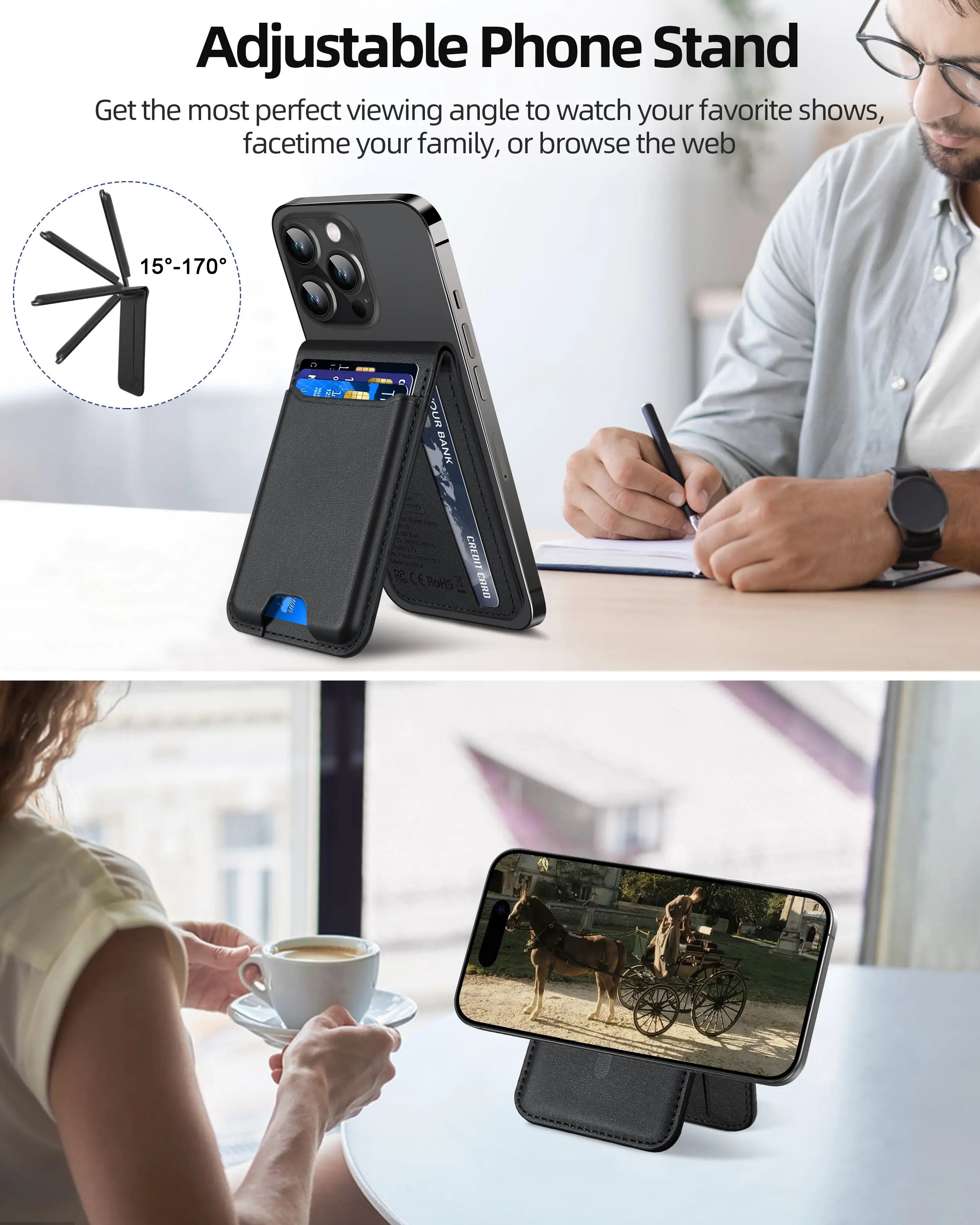 Don’t believe what they say. It won’t even close if you have credit cards in it I have four credit cards on each side and the thing won’t even close. There’s no way you can connect it to the back of your phone and have it closed flat. It stays open like this it’s a waste of money.