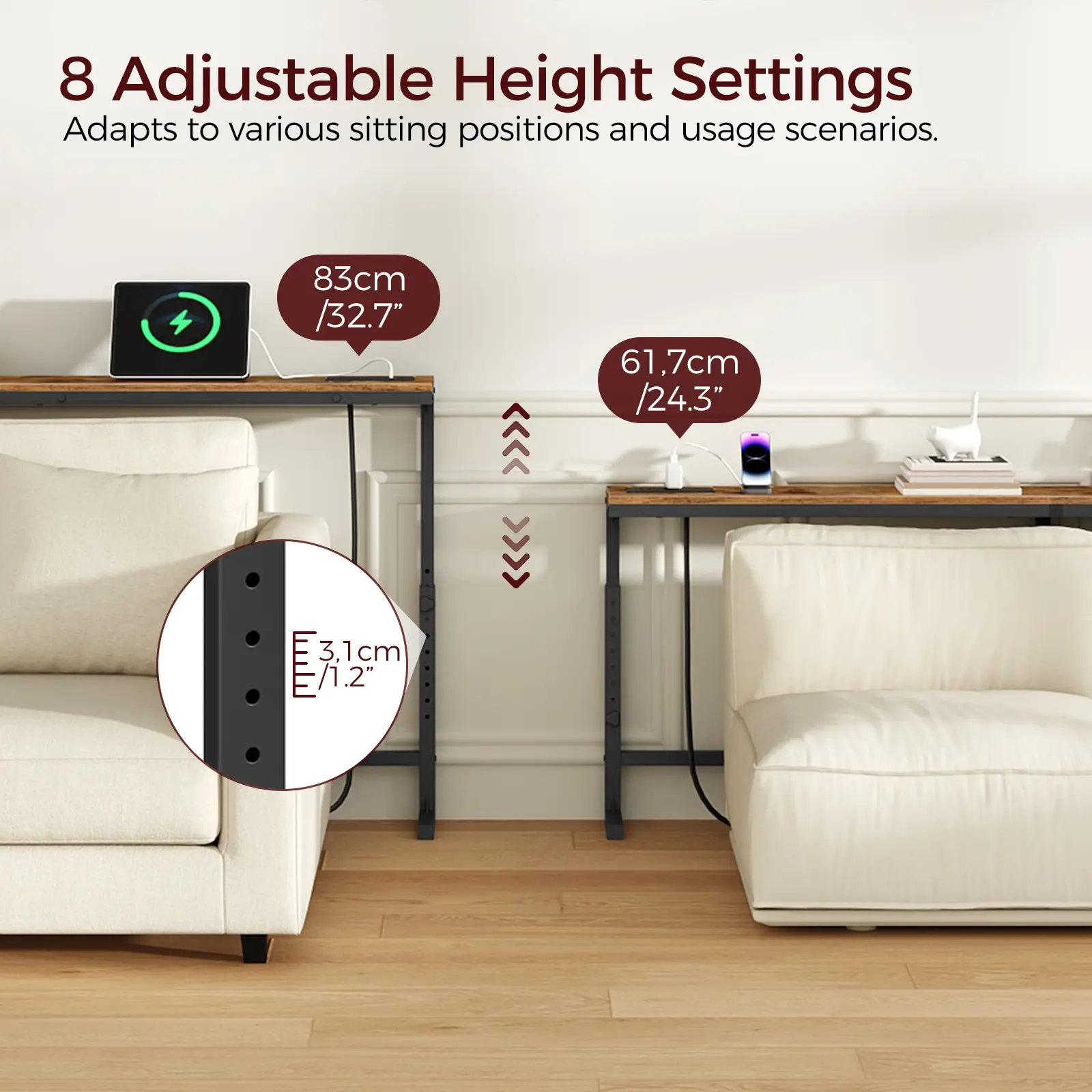 ·8-Level Height Adjustment: Easily adjust the table to fit any setting with 8 height options, allowing you to adapt seamlessly to different sofas, desks, or storage needs. This flexibility ensures that your table meets the diverse requirements of your home