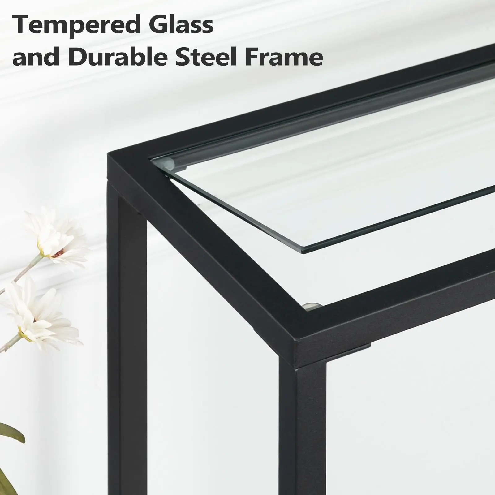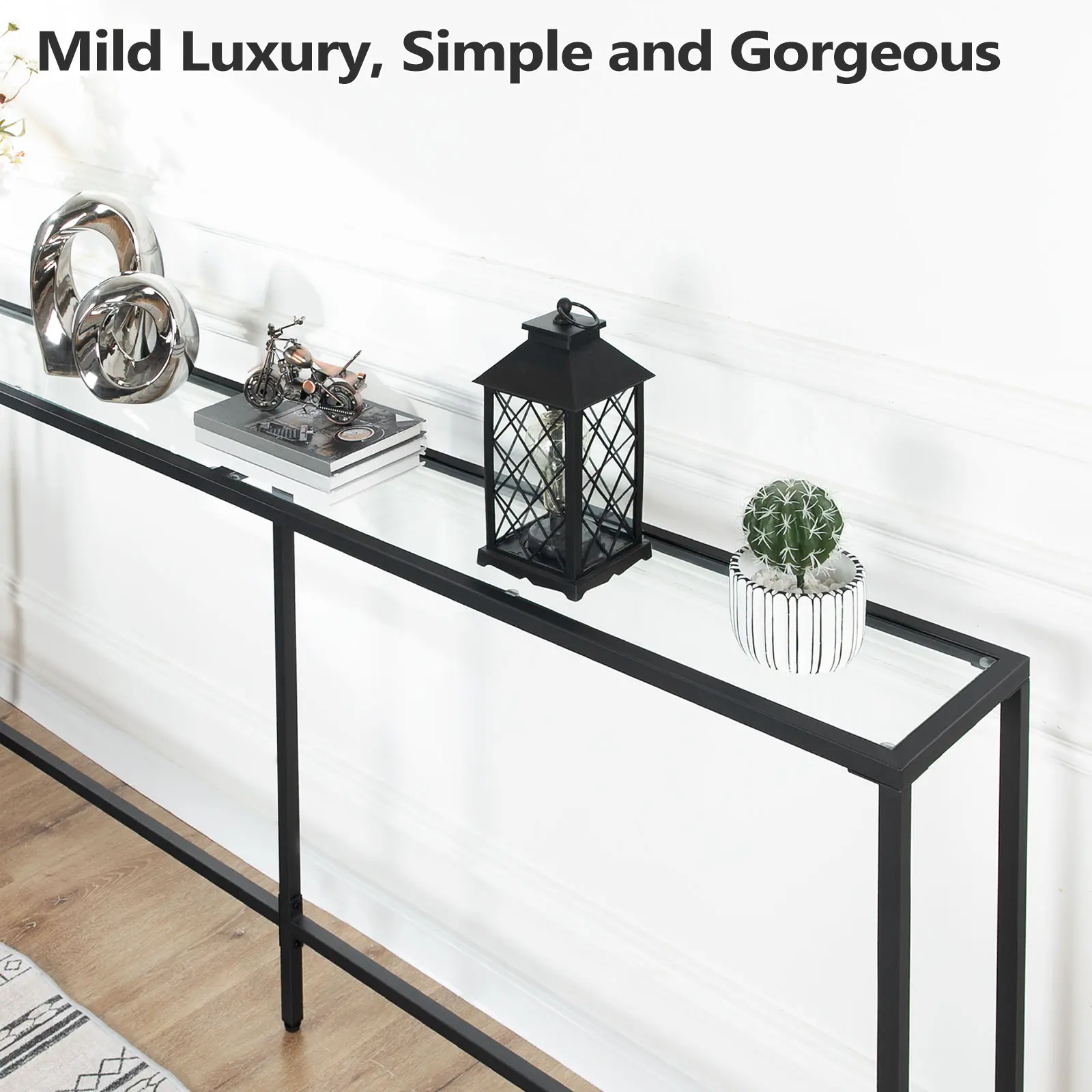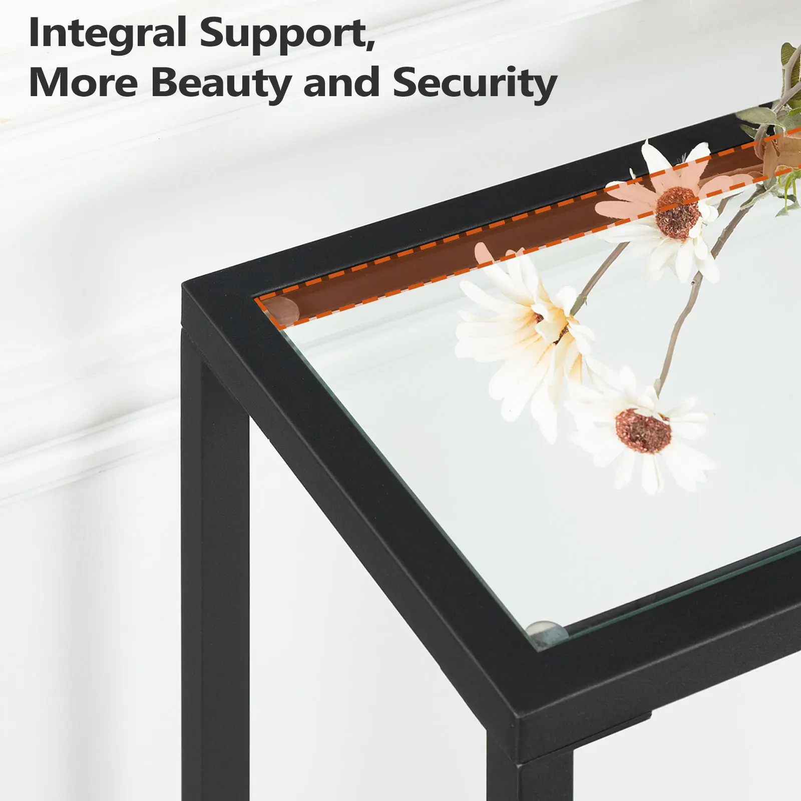 The integral tempered glass support strengthens the structure and solidifies the load capacity. This modern console table maintains strong load ability with high compatibility of tempered glass and metal frame. It's both invisible and beautiful.