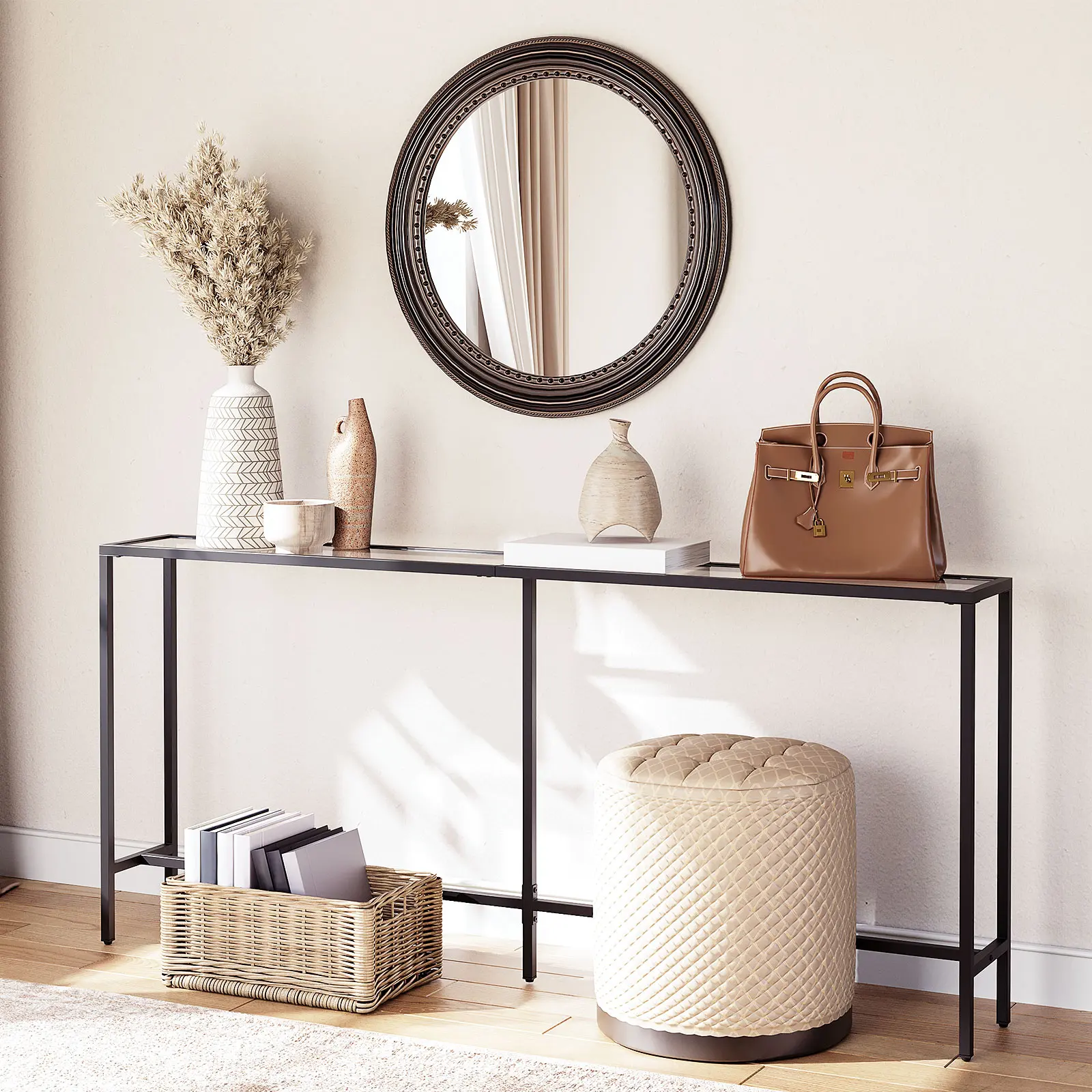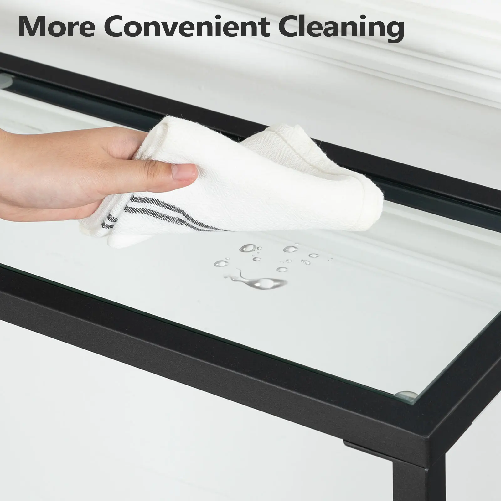 Made of tempered glass and a durable steel frame, this console table features easy cleaning and outstanding firmness. The 3mm noise-proof pads assure the glass table’s friction and security.
