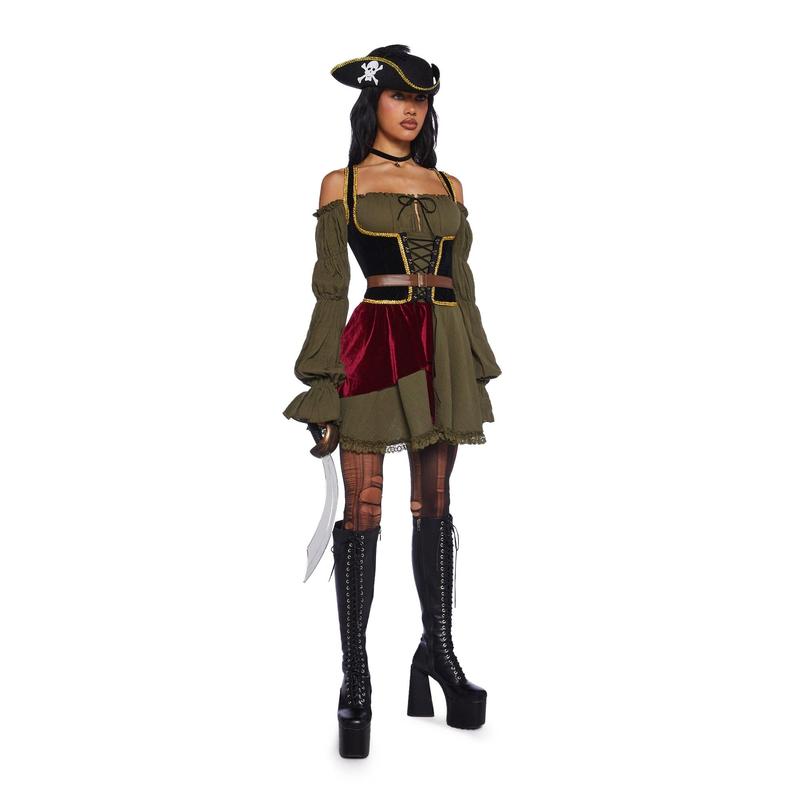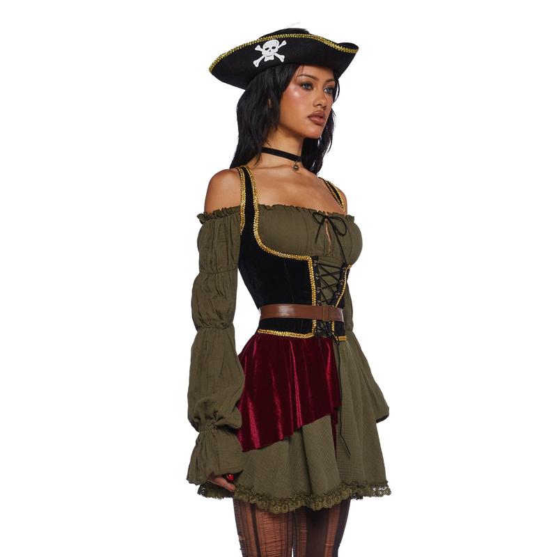 cuz you never looked this sexy at sea! This costume set includes an off the shoulder mini dress with long sleeves, an off the shoulder design, velvet detailing, a ruffled trim, shoulder straps, lace up detailing, sword and pirate hat.
