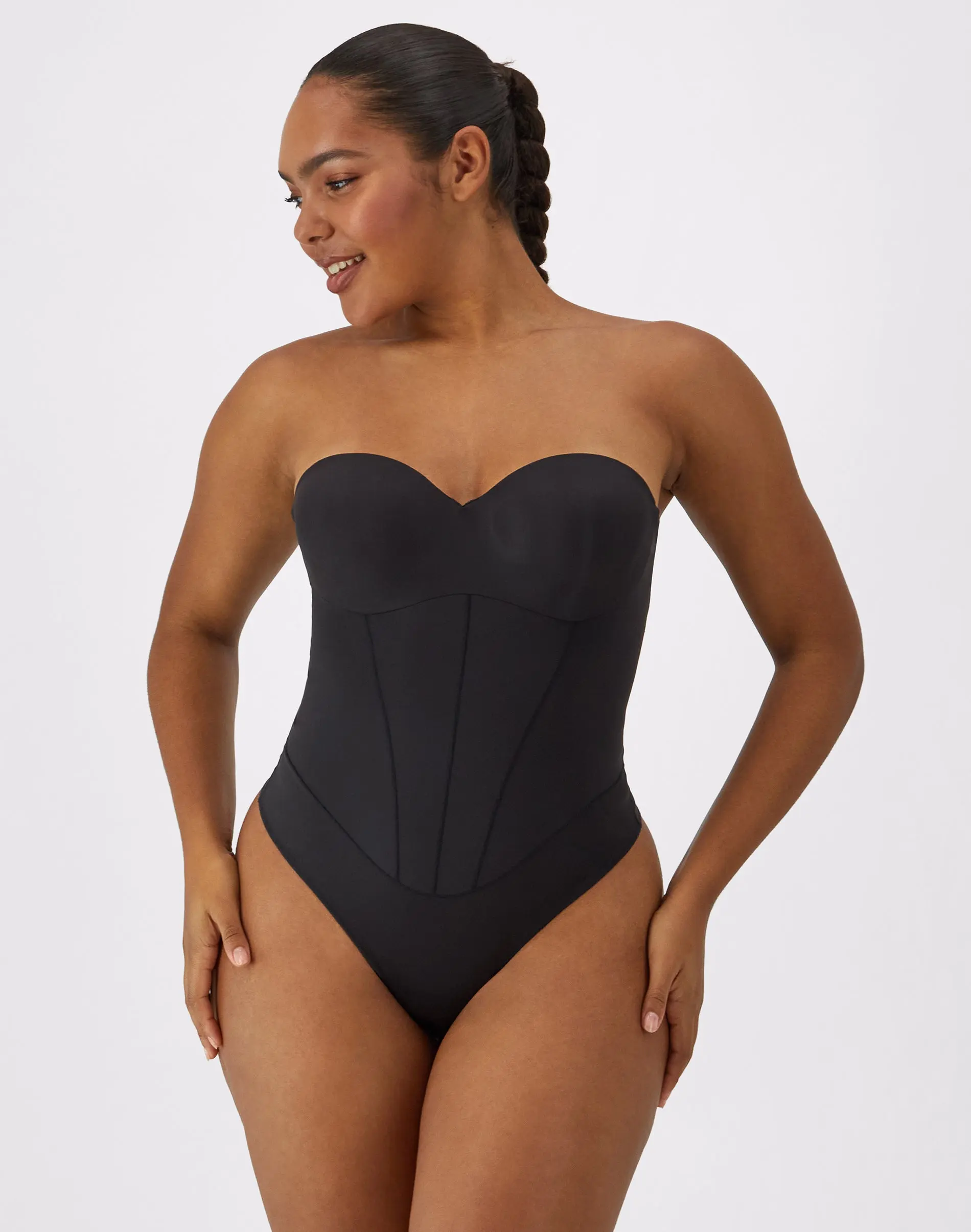 DRAMATIC DESIGN - Faux corsetry lines help produce an hourglass appearance in bodysuit shapewear that features a sexy balconette neckline.