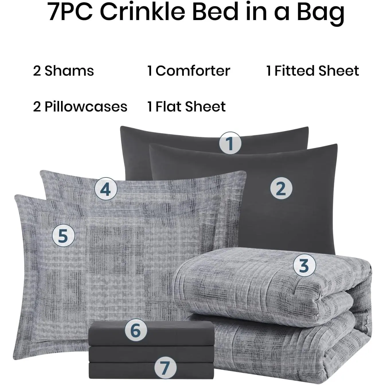 Package & Size: Full size bed in a bag for all your bedroom needs. Crinkle textured design bedding sets including 7 pieces: 1 comforter 80"*90", 1 flat sheet 81"x96", 1 fitted sheet 54"x75"+14", 2 shams 20"x26", 2 pillow cases 20"x30".