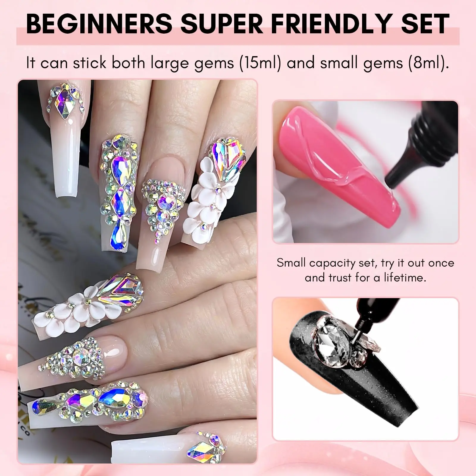 ·Beginner's Super Friendly Set - 15ml rhinestone glue is thicker and more suitable for large gems and 3D effects, allowing beginners to have reaction time. 8ml rhinestone glue should be diluted slightly, which can naturally flow flat and is more suitable for small rhinestones; it’s also very suitable for drawing lines, and the pen tip can be used for 3D effects (with more glue), as well as precise point rhinestones. Small capacity set, try it out once, and trust for a lifetime!