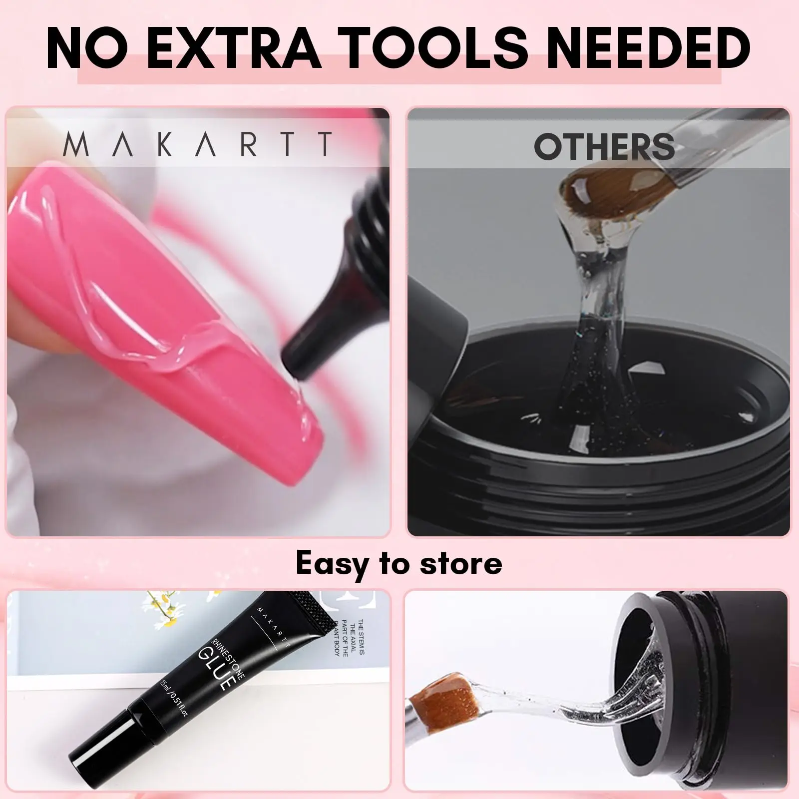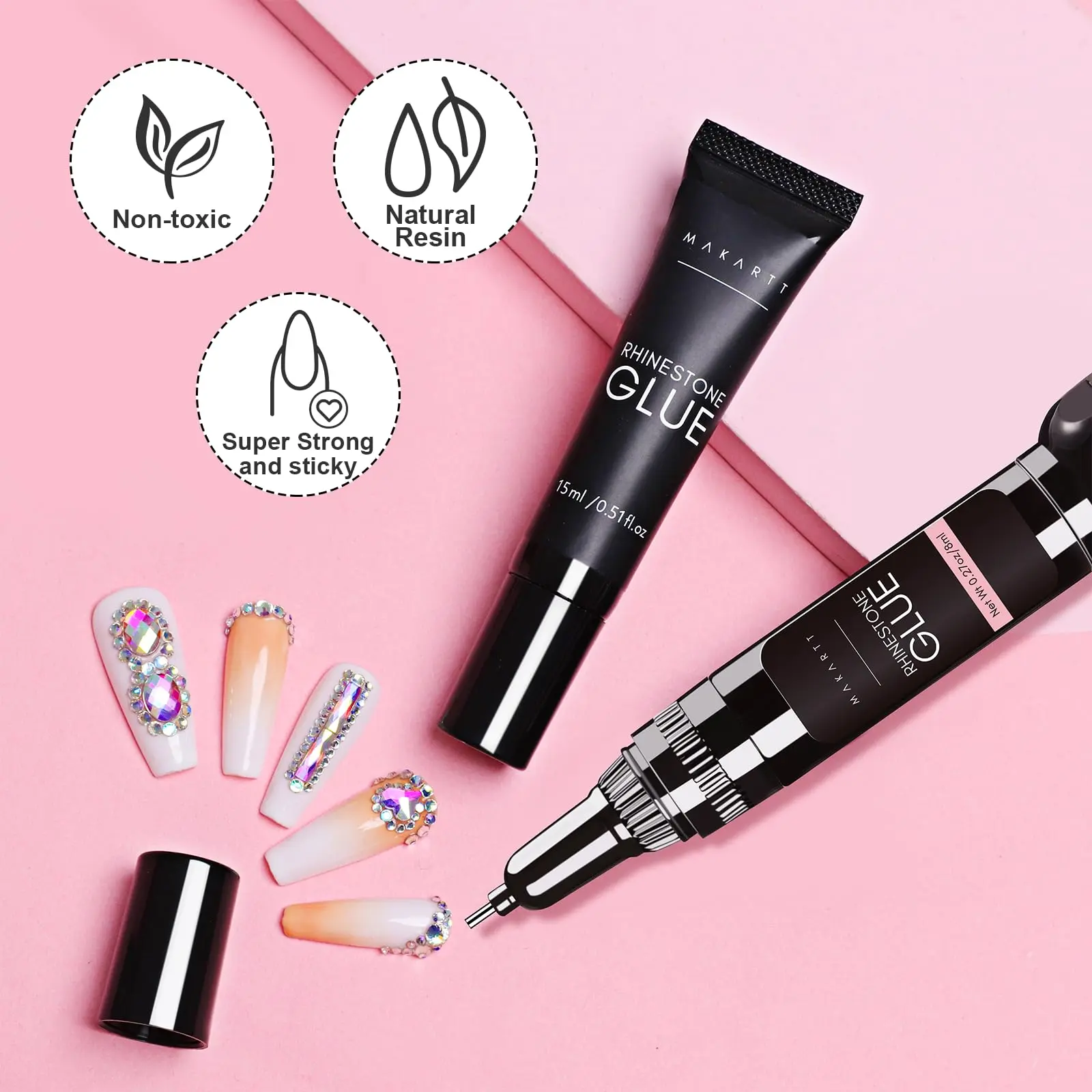 ·Strong Adhesive Rhinestone Glue - Makartt rhinestone glue gel is suitable for natural nails and artificial nails, press-on nails, gel nail polish nails, etc. Nail art glue is specially designed for sticking jewelry, and nail glue gel has super strong adhesion and is not easy to peel off. Using rhinestone glue and chrome nail powder can create a fashionable 3D nail shape, which is very luxurious. A great nail artist supplies!