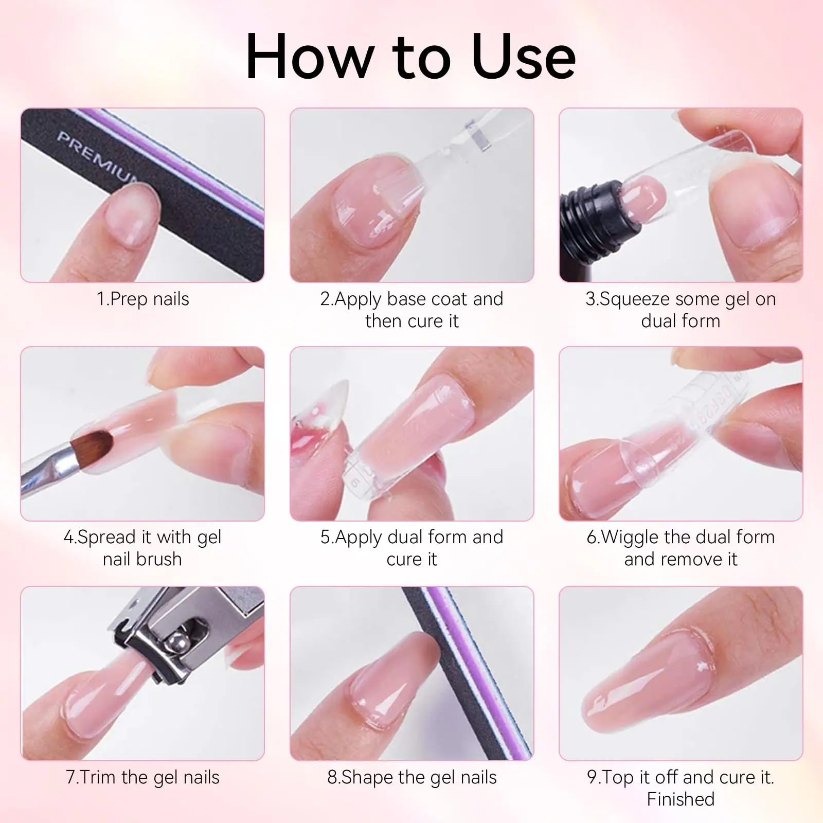 ·Warm Tips- To remove the gel nail extensions, you can file it off with a nail file or a nail drill machine because it is not a soak-off gel. For curing the gel extension better, you can cure with a nail lamp in 60-120s(not included in this nail kit)