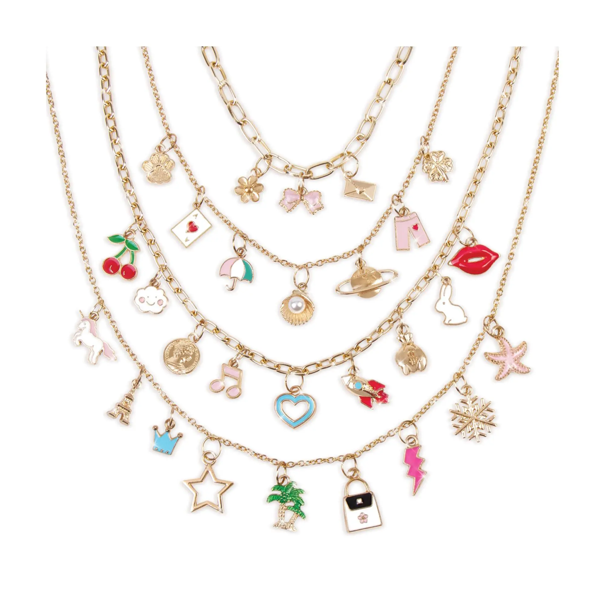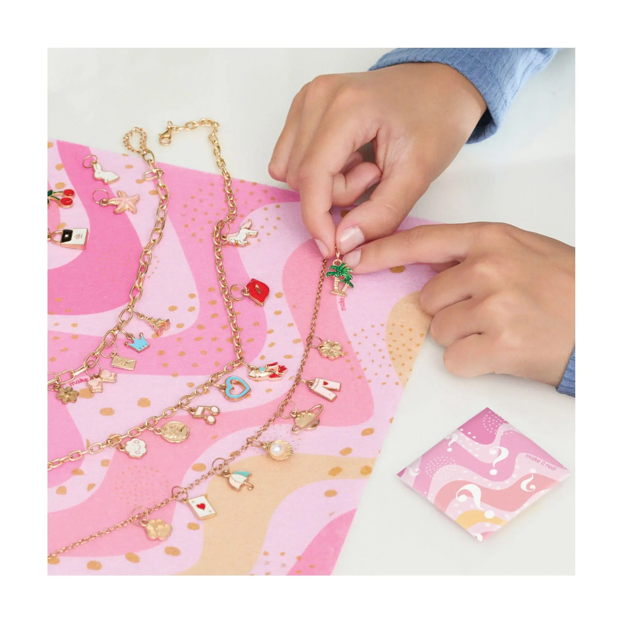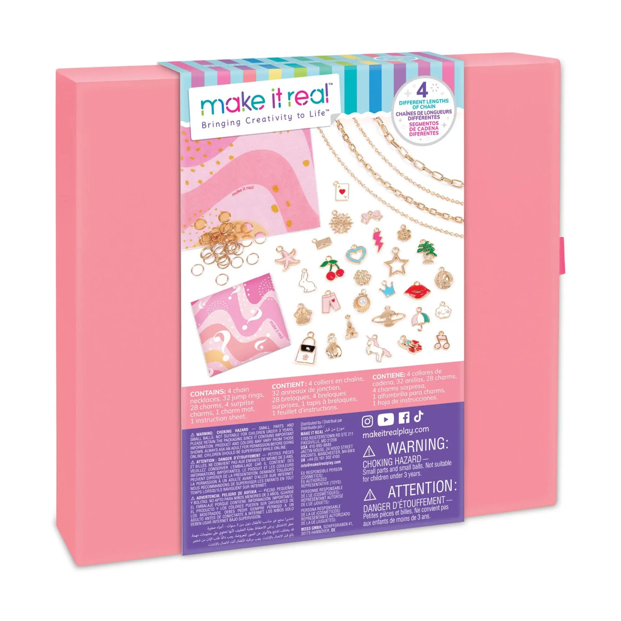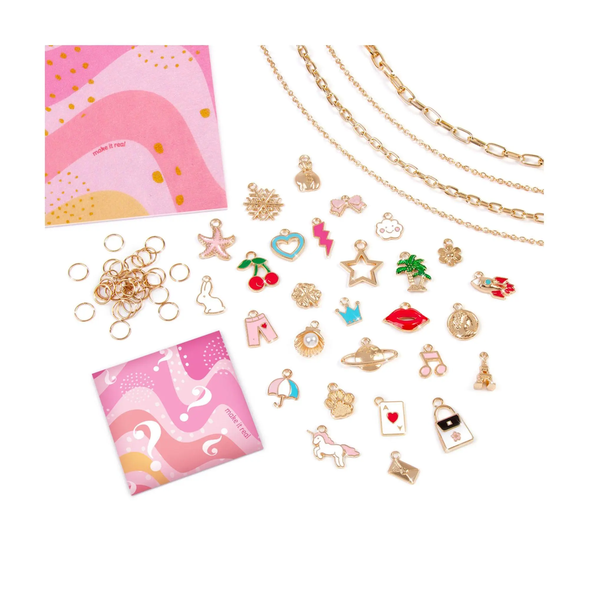 ·Includes four chain necklaces, 32 jump rings, 28 charms, four surprise charms, one charm mat, and instruction sheet