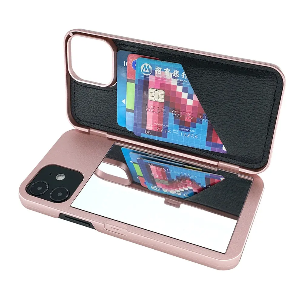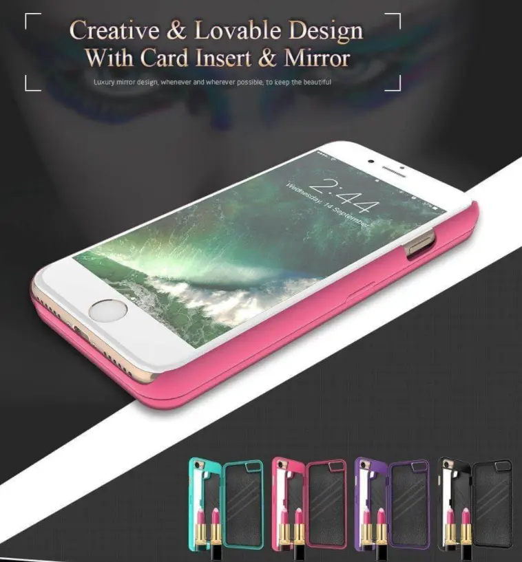 This case is perfect for any girl on the go. It offers a mirror and storage for your phone, ID, credit card and cash. This way you can touch up your make-up while on the go.