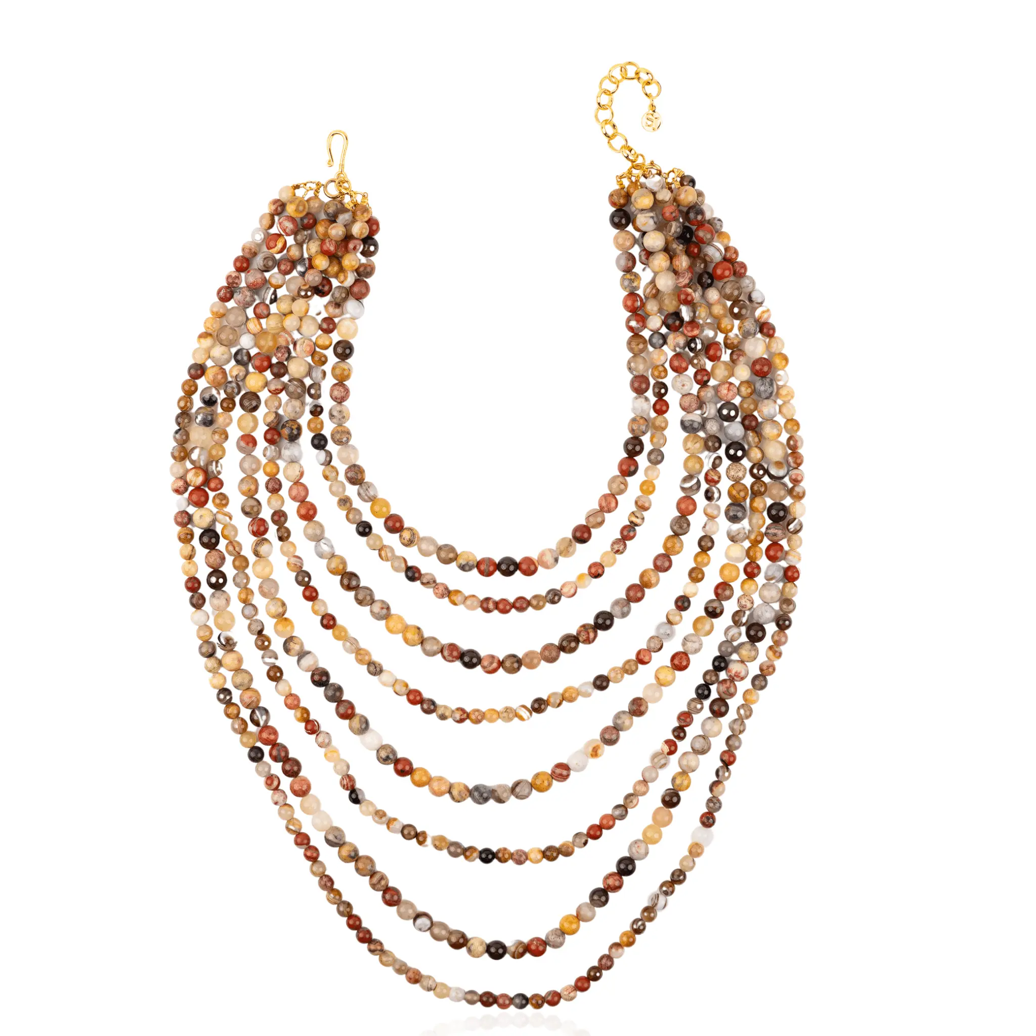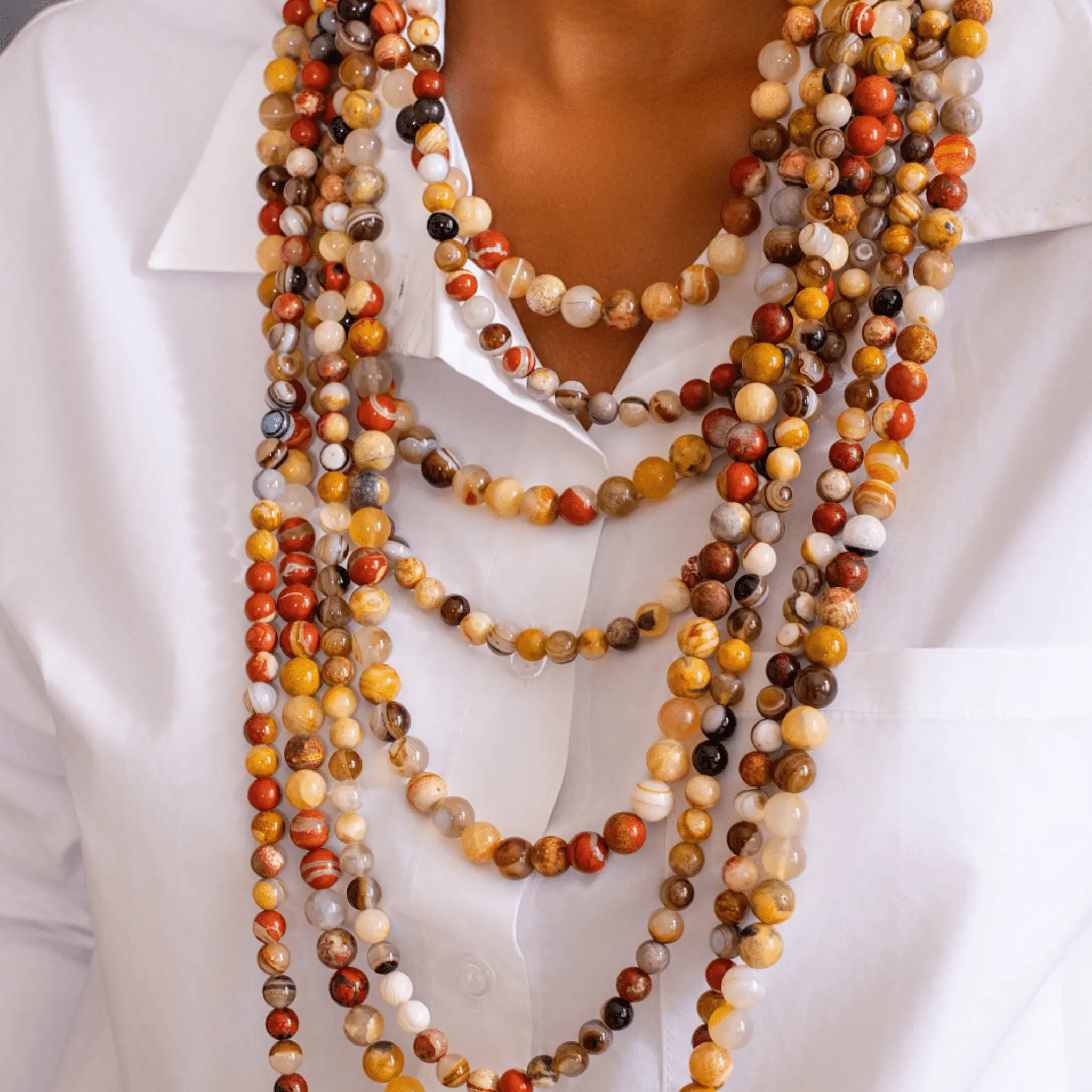 Command the room with confidence and grace in the Makemba 2-in-1 Jasper Beaded Statement Chain – Desert Storm. This handcrafted masterpiece features natural jasper gemstones in stunning earthy hues — caramel, terracotta, amber, ivory, and stone grey — that celebrate strength and serenity.