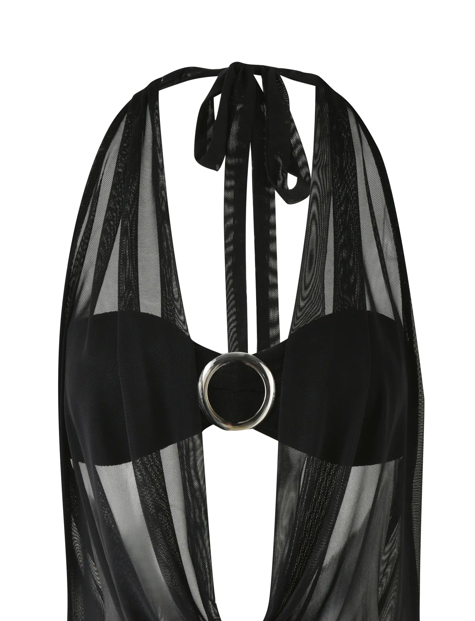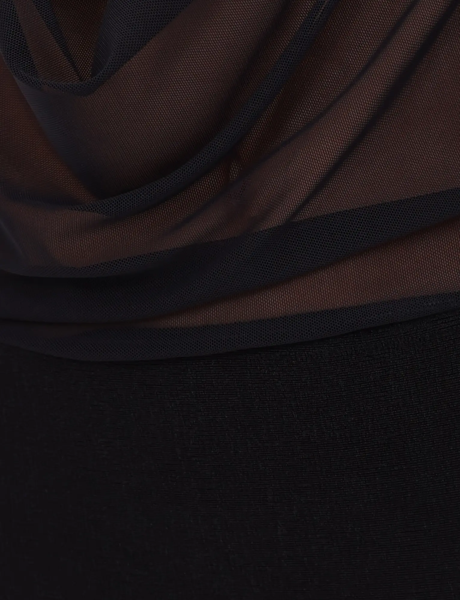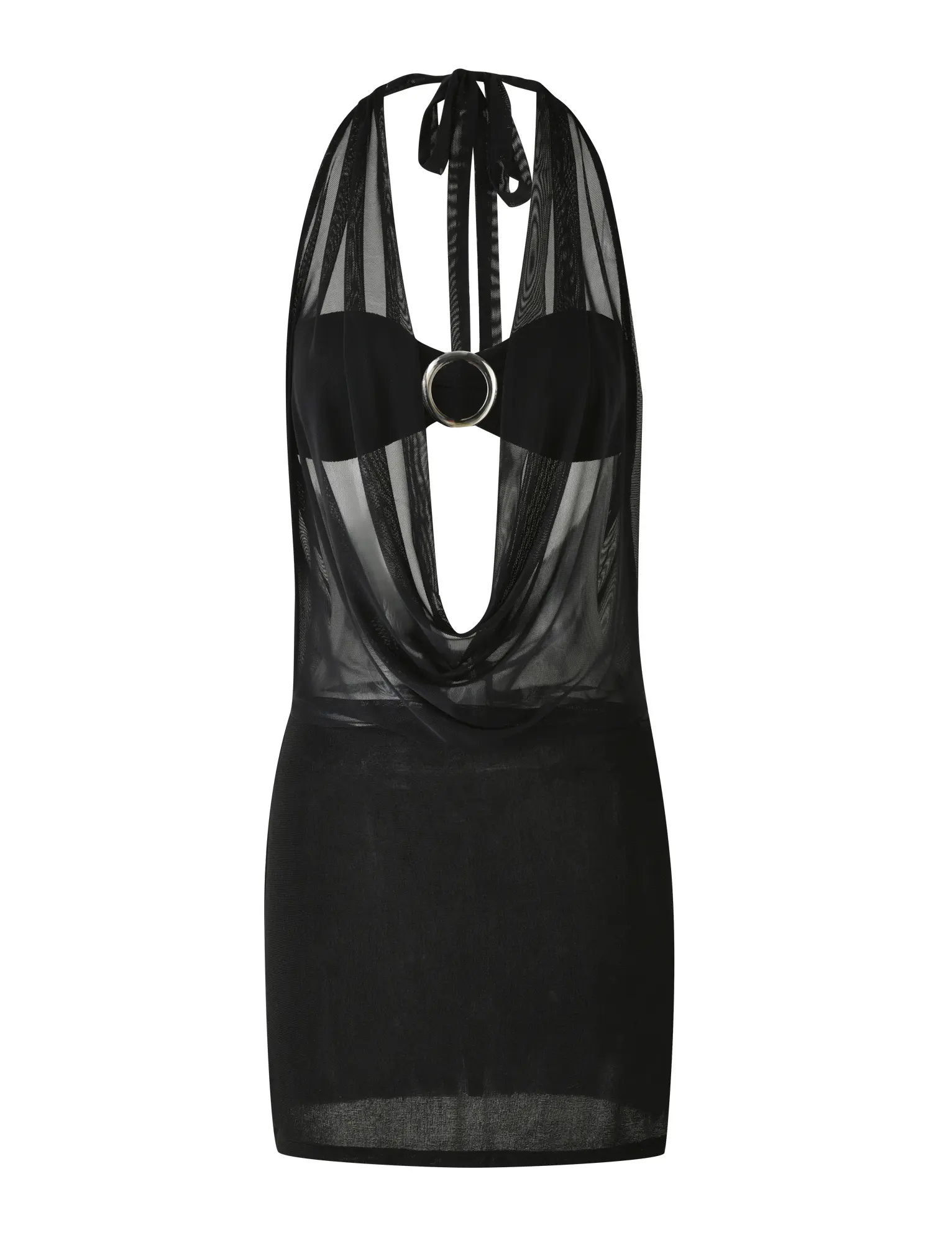 Our best-selling Makena Two-Piece Top as a new dress silhouette Two-piece dress - Mesh dress and matching bra style top Mesh cowl neck halter with true-tie at back Exposed back Bottom half panel is a lurex knit fabrication with thigh split
