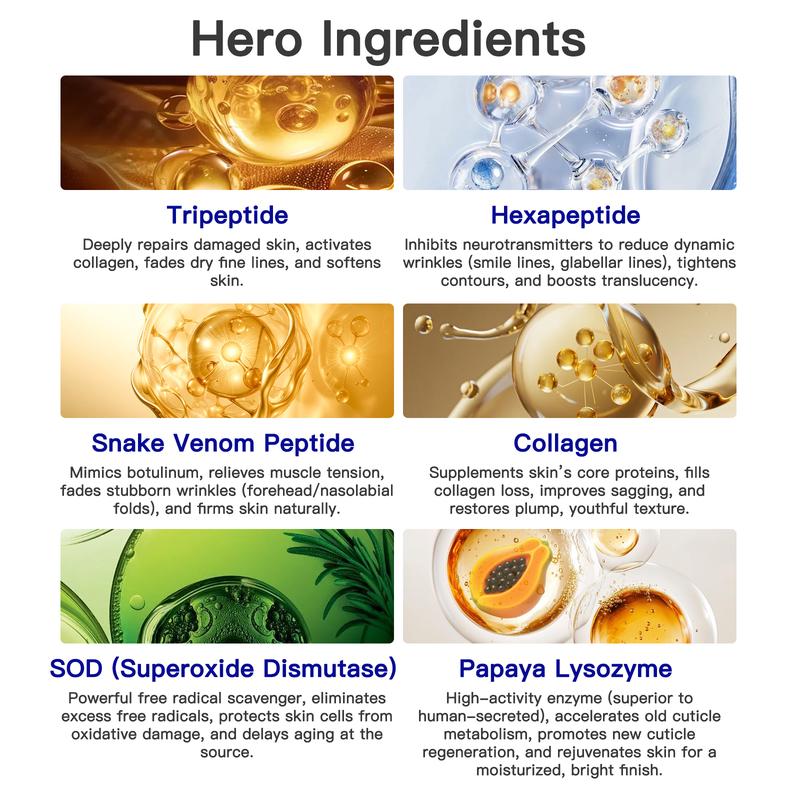 We blend tripeptide, hexapeptide, and Syn-Ake (synthetic snake venom peptide) — a rare 3-peptide combo that targets both dynamic and static wrinkles, far more effective than single-peptide anti-aging products.