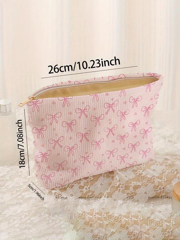 Cute Bow & Heart Pattern Corduroy Makeup Bag, Handheld Cosmetic Pouch, Makeup Organizer Pouch, Lightweight Portable Toiletry Bag, Multi-functional Storage Bag, Travel Makeup Bag, Suitable for Leisure Travel and Various Occasions
