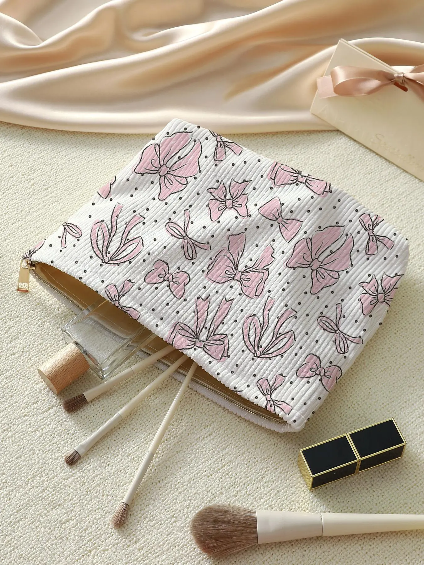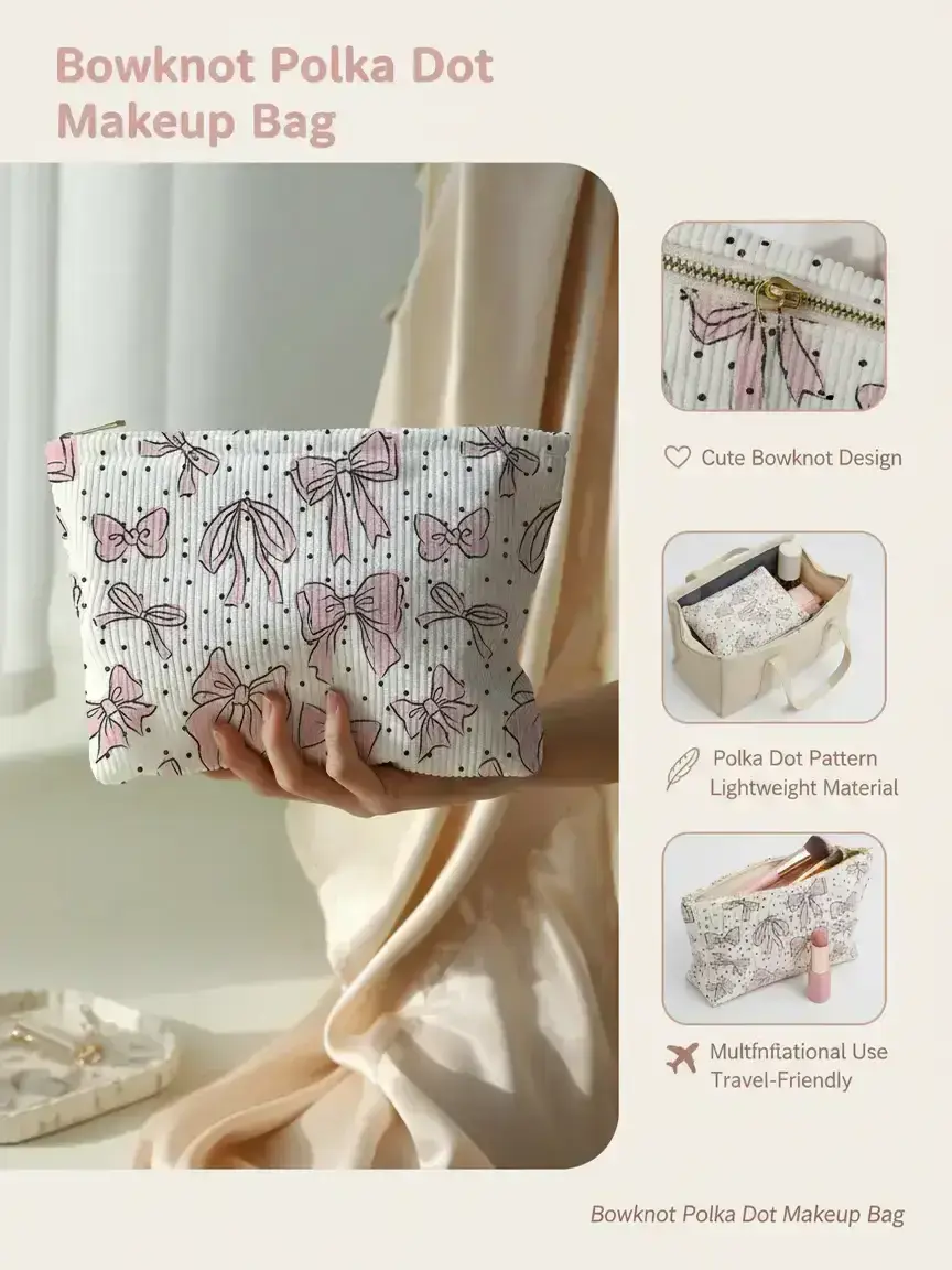 Cute little bow make up bag, delivered quickly. Fits all my make up. I love it.