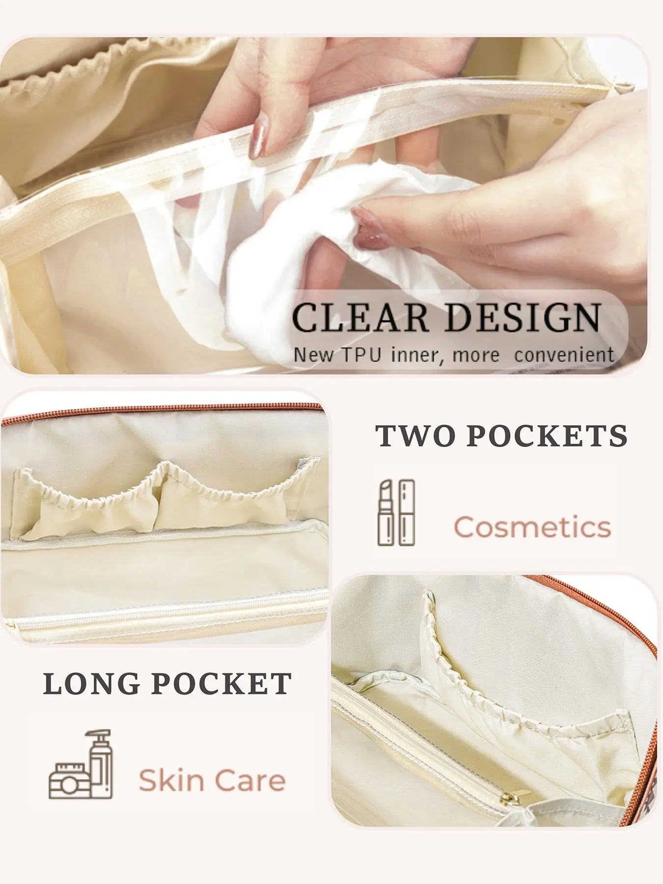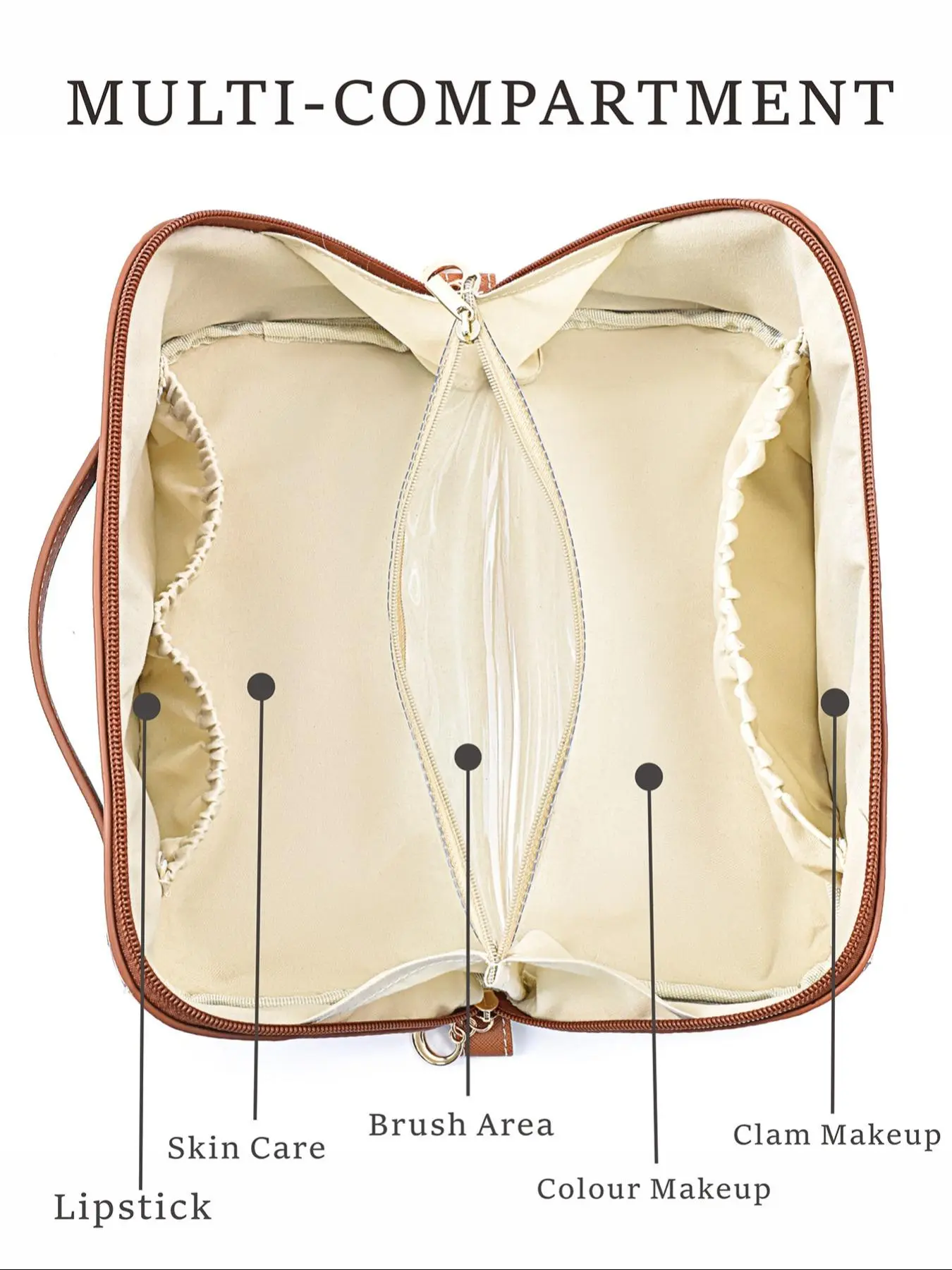γWaterproof PUγ: Crafted from waterproof PU material, this makeup bag ensures your cosmetics stay dry and secure, no matter the weather conditions.