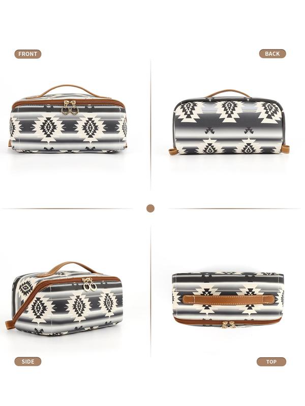 This is a really pretty toiletries bag! Opens up nice angle fits full sized makeup brush. Came with a simple dust cover storage bag.