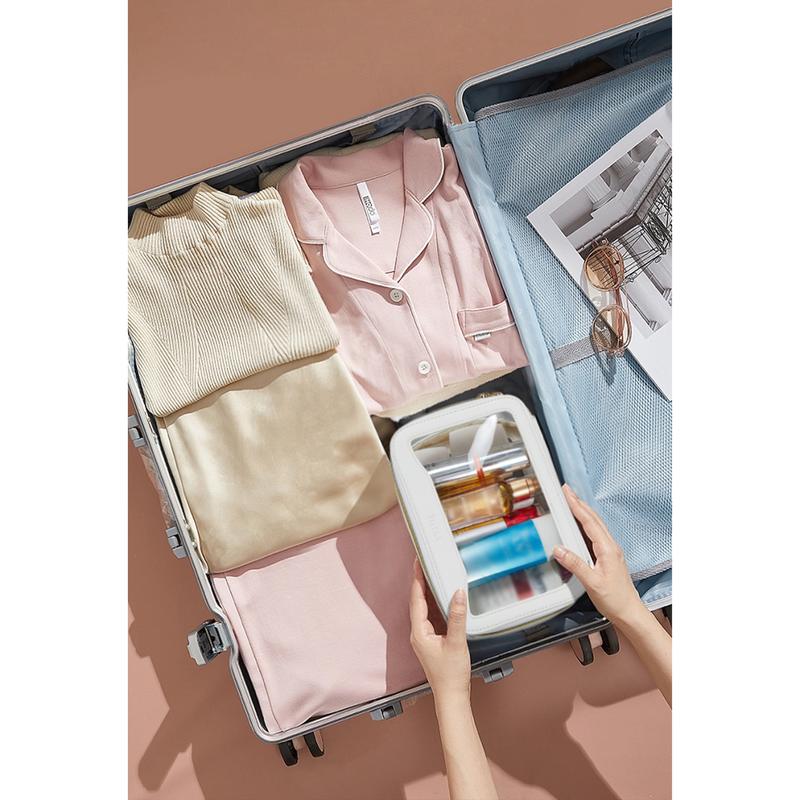 Measuring 9.05" x 4.52" x 6.1", this makeup bag fits all your daily or travel essentials like cosmetics, skincare, toiletries, and more.