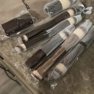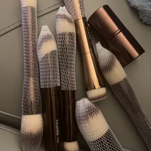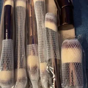These are beautiful brushes and a nice bag to store them in.They all come in the netting around the brush heads to keep them from getting damaged. The brush heads are very dense and soft. Very impressed by the quality.