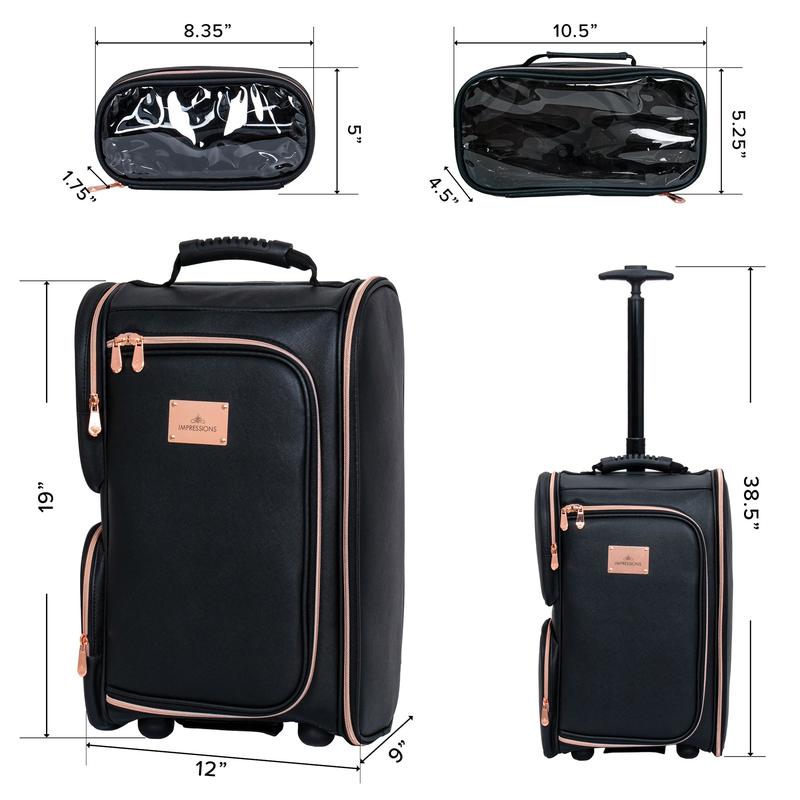 📏 Dimensions & Pouches The case includes 5 removable pouches: 3 medium pouches with carry handles and 2 small pouches. Medium pouch dimensions and small pouch dimensions are provided. This overall travel case ensures your essentials are neatly stored and accessible during your travels.