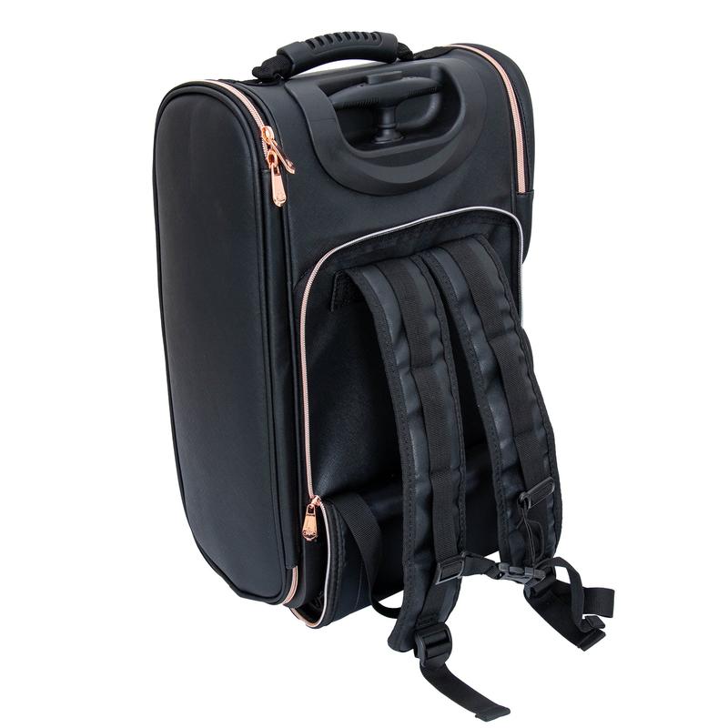 ✨ Features & Benefits • Zip closure • Telescoping pull handle • Exterior zip pockets • Interior wall pockets • Hidden backpack straps • Lined • Durable Faux Leather and easy to clean