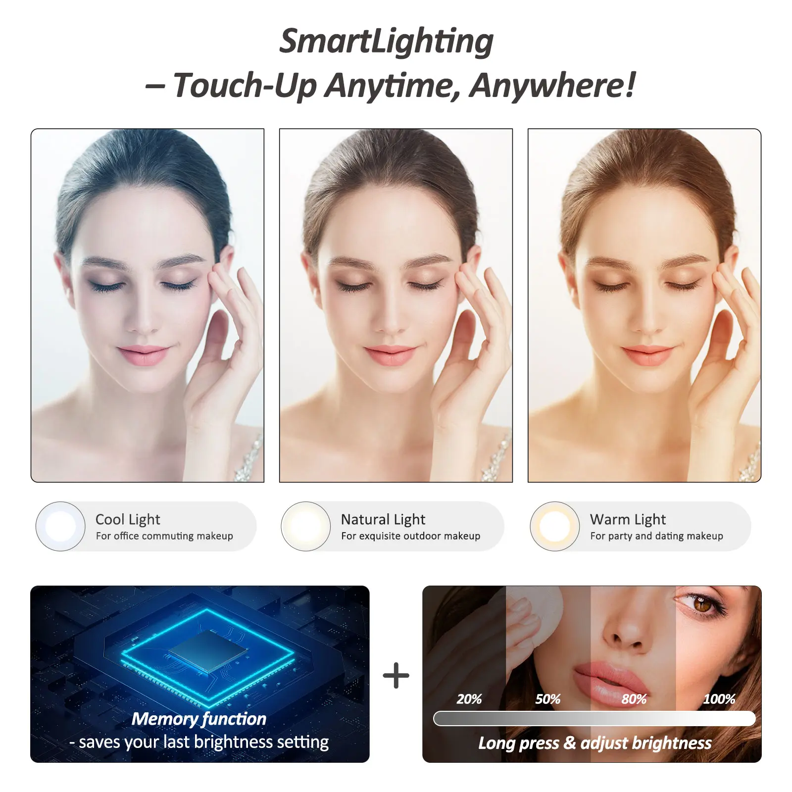 Great quality for the price. It’s the perfect size for all your makeup/hair product needs. There are three different light colors. You can press and hold the button to dim the light. The straps on each side keeps the mirror up. It’s rechargeable and you can customize the space In the box.