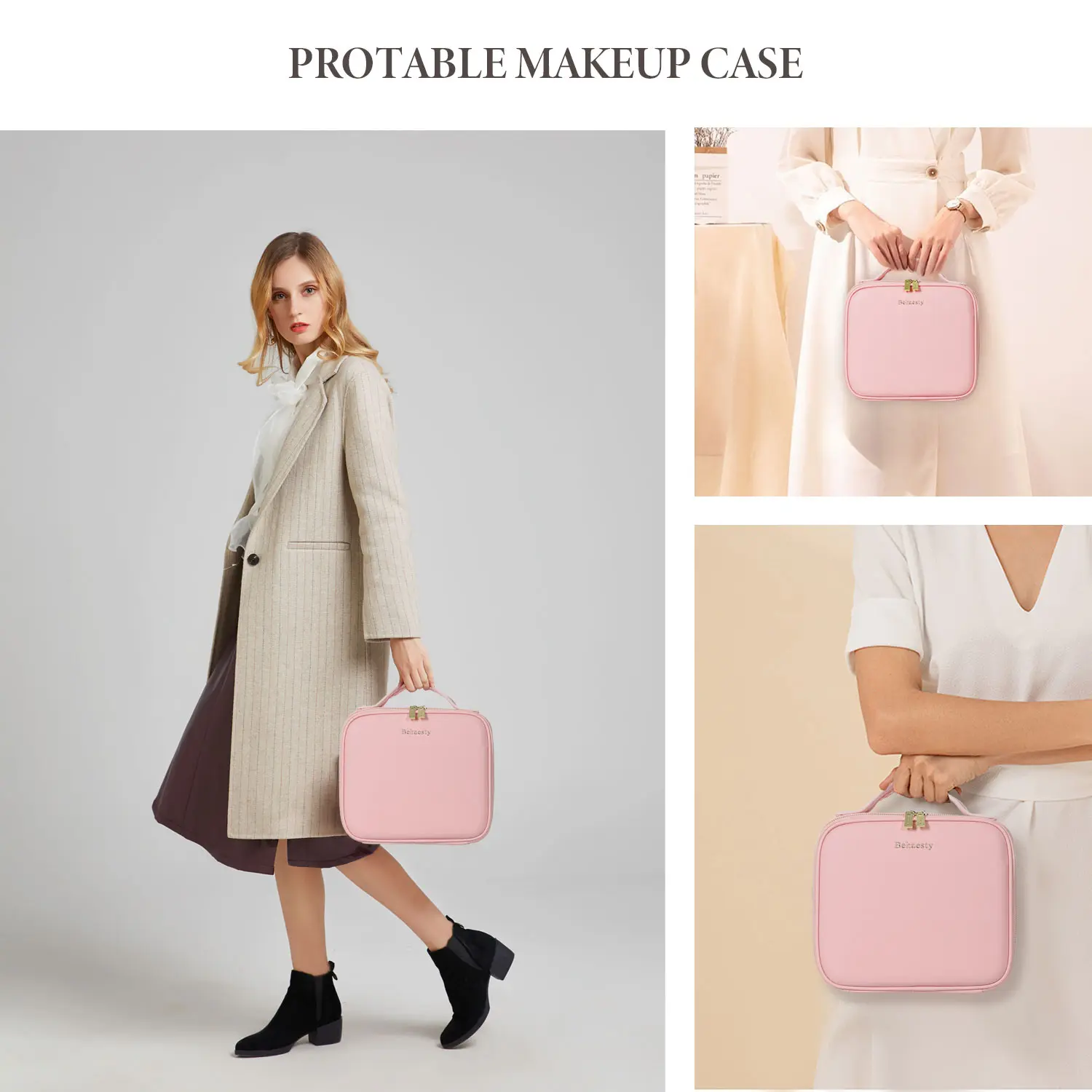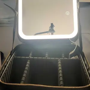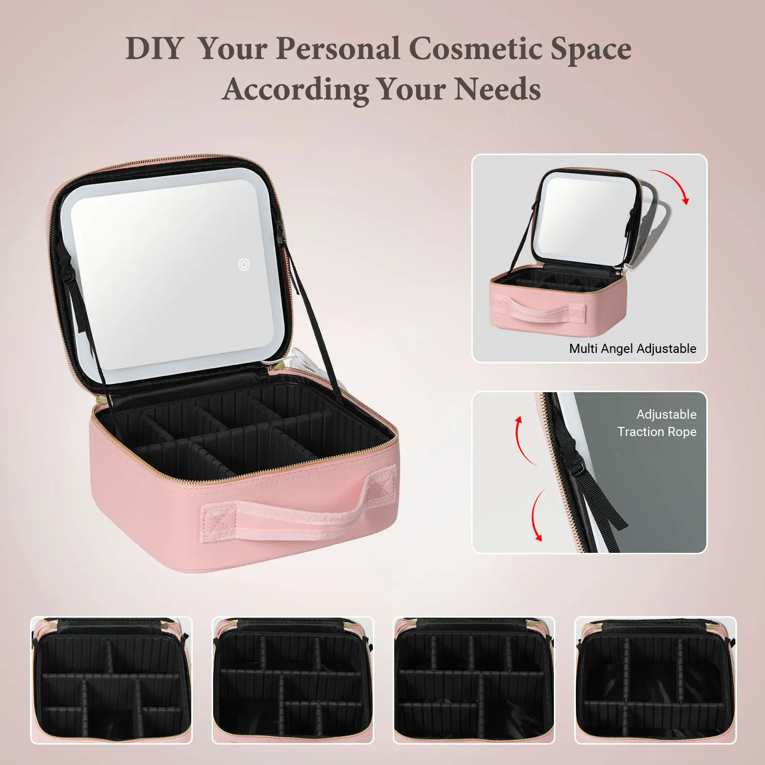 Absolutely love this makeup case! It has LED Lighted rechargeable mirror and adjustable slots and straps to adjust the mirror! Nice sturdy zippers and great for travel..Highly recommend