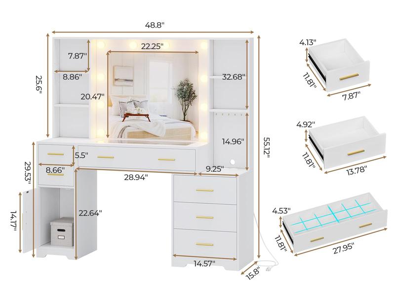 ✨ Elevate your makeup routine with the Sikaic Modern White Makeup Desk! This sleek desk features a glass tabletop and 6 drawers for ample storage. Crafted from engineered wood, it offers a modern finish in white. Perfect for bedroom organization, it includes power outlets for convenience. Dimensions: 15.75"D x 48.8"W x 55.1"H. Weighing 113.5 pounds, it's a sturdy addition to any space.