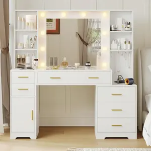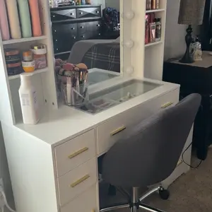 This makeup desk is ideal for keeping your bedroom organized. The glass tabletop and power outlets add functionality. The modern design complements any bedroom aesthetic. With its ample storage, it's a practical choice for makeup enthusiasts.