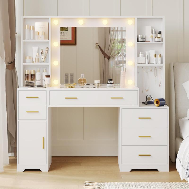 5. Sikaic Modern White Makeup Desk with 6 Drawers, Glass Tabletop, Power Outlets, Engineered Wood, 15.75"D x 48.8"W x 55.1"H, Bedroom Organization Storage