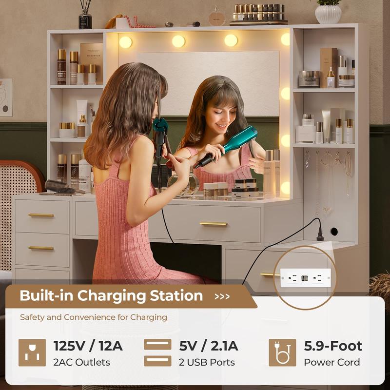 Sikaic Modern White Makeup Desk with 6 Drawers, Glass Tabletop, Power Outlets, Engineered Wood, 15.75"D x 48.8"W x 55.1"H, Bedroom Organization Storage