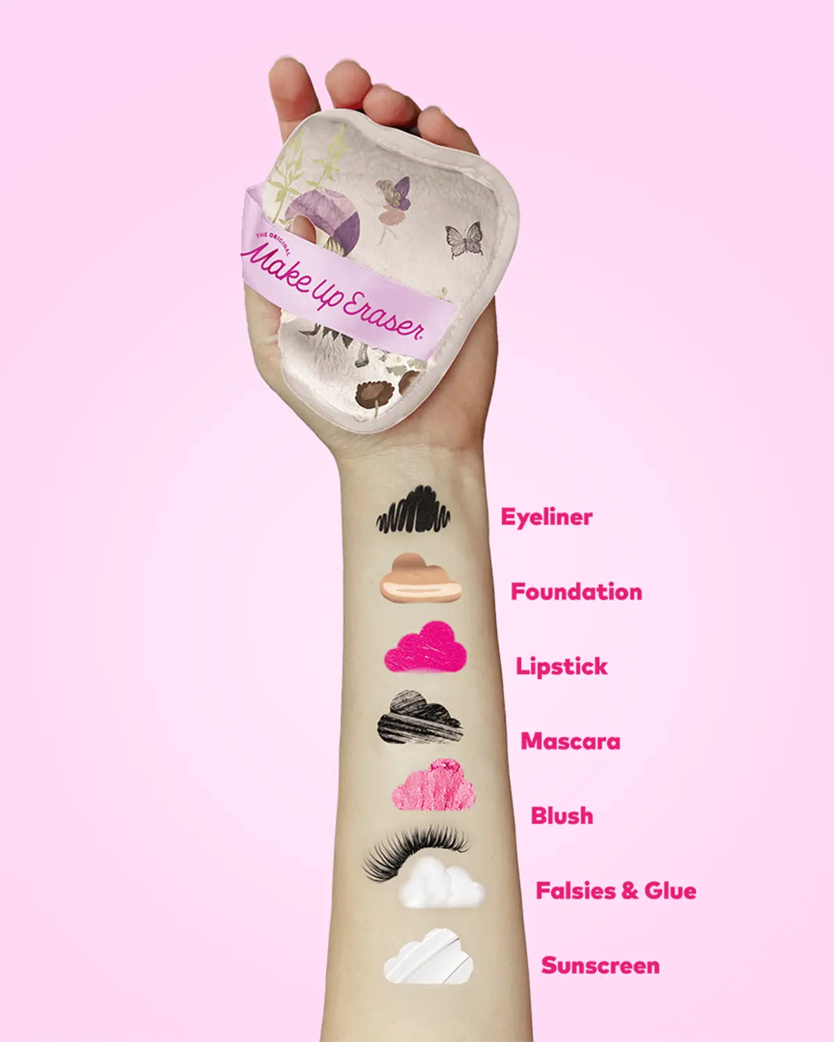 Erase all makeup with JUST WATER™ including waterproof. Our patented, water-activated, cloud-soft fibers gently & easily remove all makeup & sunscreen from pores. 2 in 1 benefit: one side erases makeup & one side exfoliates skin.