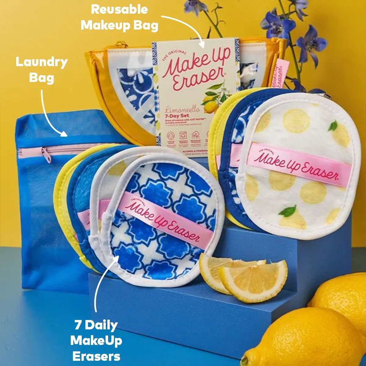 Includes 7 MakeUp Erasers, 5in x 4in. Makeup bag + laundry bag included.