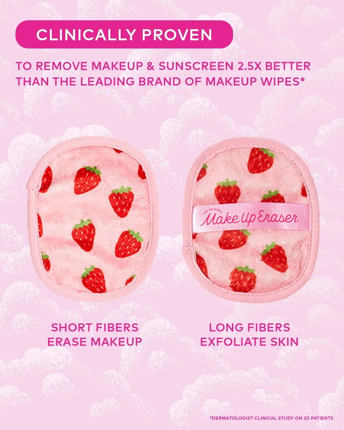 Erase all makeup with JUST WATER™ including waterproof. Our patented, water-activated, cloud-soft fibers gently & easily remove all makeup & sunscreen from pores. 2 in 1 benefit: one side erases makeup & one side exfoliates skin.